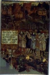 | Keywords: MCC-42054 Veelluik met het martelaarschap van de H. Theodosia (24).jpg Artwork nl Anonymous Gelre nl Middenstuk 1 Theodosia verzoekt toelating tot de gevangenis Rechtsboven een engel met banderol waarop de tekst Ghi sijt verhoert die geve die ghi do bidt heb ick gevestigt mit mijnen gelt die martelie te liden 2 Theodosia wordt bij de magistraat ter verantwoording geroepen Op het tekstbord Desen s alch sal ick mitter hulpen des heren voer s en 3 Theodosia ™s marteling aan de hefboom Op het tekstbord Ic ben bereyd dinc voer iezus christo te liden 4a Theodosia aan de schandpaal 4b Theodosia ™s ledematen worden uitgerekt 5 Allegorische voorstelling Christus aan het kruis met het offerlam op zijn schouders; onder het kruis negen schapen Op de voorgrond links een non rechts koning David met een gouden kroon op zijn hoofd en een herdersstaf met schep in beide handen die hij naar de non uitsteekt; tussen hen in ligt een harp Op het tekstbord suster hoede die scapen dier gedacten in die minne des brudegoms iesus opten berch caluarie 6a Theodosia uit het water gered door twee engelen 6b Vijf nonnen en een vrouw in wereldse kledij bezoeken Theodosia in de gevangenis Op het tekstbord min medes elen in cro Christo den enge w ech Het opschrift op de lijst onder de voorstelling is onleesbaar 7 Theodosia voor de wilde dieren geworpen Op het tekstbord nu suldi bekennen hoe vol si vermogen die god mit pueren herten minnen 8 Onthoofding van Theodosia Op het tekstbord dat ic inren tiit des vreden heb vercregen dat sal ic inden striit nie verliesen 9a Verschijning van Theodosia aan haar ouders Op het tekstbord sieh hoe soet die glorie ist daer du mi af beroeven wolste 9b Begrafenis van Theodosia Een zwevende engel met banderol waarop si heft nu salighe vrocht Aan weerszijden van deze taferelen zijn vrouwelijke heiligen afgebeeld steeds twee aan twee met tussen hen in een geknielde non Op de eerste voorstelling links in plaats van een vrouwelijke heilige Maria met kind Links 10a Madonna op de maansikkel en Fides Opschriften / fides 10b Caritas en Spes Opschriften niet leesbaar 11a Agatha en Dorothea Opschriften aghata / doratea 11b Apollonia met attribuut van Agatha tang waarin in plaats van een tand een borst is geklemd en Euphrosia Opschriften appolonia / effrosia 12a Anatolia en Christina Opschriften anatolia / 12b Victoria en Sophia Opschriften victoria / sophia Rechts 13a Margaretha en Gertrudis Opschriften a gretha / gertrudis 13b Ursula en Walburga Opschriften ursula / 14a Catharina en Barbara Opschriften katrina / barbara 14b Agnes en Prisca Opschriften agneta / priska 15a Cecilia en Cunera Opschriften cecilia / cunera 15b Lucia en Clara Opschriften lucia / clara Binnenzijde linkerluiken 16 Kruisdraging met Veronica en Simon van Cyrene 17 Doornenkroning Rechts een als priester geklede heilige met een kelk in de hand en een knielende non 18 Geseling Rechts een H Bisschop 19 Christus in de Hof van Olijven en de stigmatisatie van de Franciscus 20 Besnijdenis Rechts een reguliere kanunnik en een geknielde vrouw in 16de-eeuwse kledij met de attributen van de H Goedele een lantaarn geflankeerd door een engel met een brandende kaars en een duivel met een blaasbalg; daaronder het opschrift gudila 21 Ontkleding van Christus Rechts een heilige met een boek en een ladder 22 Kruisnageling Rechts de apostel Thomas 23 Christus aan het kruis met Maria Johannes en de drie vrouwen Rechts Antonius 24 Bewening Rechts de apostel Paulus en twee geknielde nonnen 25 Christus treedt de wijnpers Links Augustinus rechts een reguliere kanunnik Binnenzijde rechterluiken 26 Aanbidding der koningen 27 Geboorte van Christus Opschrift gloria in excelsis 28a Visitatie 28b Vier nonnen knielend voor een altaar waarop een drieluik met de Kruisiging Achter hen een priester Boven diens hoofd h ia Rechts daarvan een banderol met eenregelige tekst van een lied adv i g i I Fi Filius dn domini 29 Annunciatie Opschrift ave gratia plena 30 Genadestoel Rechtsonder op de voorgrond knielt een non Op het tekstbord god die alle creatueren gescapen heft en ons mit sin dierbaren bloet verlost heft hi wil ock sin gracie geuen ge eit v an der oude naam van de stichtster-non 31 Christus verschijnt aan Maria 32 Hemelvaart van Christus 33 Kroning van Maria 34 Allegorische voorstelling God de Vader gezeten op een troon met op de trappen die naar de troon voeren links de vijf wijze rechts de vijf dwaze maagden; in het midden een engel boven de hellemond met drie verdoemden Op de banderol in de linkerhand van de engel Gae t of Myt ghi vermadi vermaledijden ; op de banderol in zijn rechterhand coemt ghi gebenedide Op het tekstbord bij de wijze maagden gaet tot der gene daer se te coop is Op het tekstbord bij de dwaze maagden geft ons den olie vor ons lamp Op de banderol aan de onderzijde van de voorstelling rick der hemelen sal worden all fiere maechden Buitenzijde linkerluiken Nr 35 36 en 40 t/m 44 zijn gewijd aan de zeven vallen van Christus De voorstellingen zijn zeer verwant aan zeven houtsneden met dit thema gedrukt op één blad getiteld ˜O mensch betracht dy siben vell Christi und dy siben herzenlaydt Marie ™ Wenen Albertina inv nr 1930-70 Zuid-Duitsland ca 1480; zie Marrow 1979 p 82 89 100 106 131 170 pl VIII 35 Christus ™ val voor de kruisnageling zesde val 36 Kruisoprichting zevende val 37 Allegorische voorstelling Christus als Man van Smarten en gebonden aan de geselpaal houdt een rood koord vast dat verbonden is met een knielende non Tekstrol Christus o dochter vollighet my want ic gepassijt bin voor di wilt mij u hert geven om ewich te leuen Tekstrol non here ic offer u myn hert nu ende inder ewicheit Achter de non zeven kleinere opschriften verwijzend naar zeven deugden elk voorafgegaan door een hand met een geselroede waarvan de eerste en de derde onleesbaar zijn 2 die mel it mildheid ; 4 gehoorsamheijt; 5 wakinge; 6 silencia ; 7 arheyt waarheid 38 Allegorische voorstelling In een ommuurde tuin slaat Christus met een hamer o