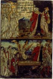 | Keywords: MCC-42054 Veelluik met het martelaarschap van de H. Theodosia (27).jpg Artwork nl Anonymous Gelre nl Middenstuk 1 Theodosia verzoekt toelating tot de gevangenis Rechtsboven een engel met banderol waarop de tekst Ghi sijt verhoert die geve die ghi do bidt heb ick gevestigt mit mijnen gelt die martelie te liden 2 Theodosia wordt bij de magistraat ter verantwoording geroepen Op het tekstbord Desen s alch sal ick mitter hulpen des heren voer s en 3 Theodosia ™s marteling aan de hefboom Op het tekstbord Ic ben bereyd dinc voer iezus christo te liden 4a Theodosia aan de schandpaal 4b Theodosia ™s ledematen worden uitgerekt 5 Allegorische voorstelling Christus aan het kruis met het offerlam op zijn schouders; onder het kruis negen schapen Op de voorgrond links een non rechts koning David met een gouden kroon op zijn hoofd en een herdersstaf met schep in beide handen die hij naar de non uitsteekt; tussen hen in ligt een harp Op het tekstbord suster hoede die scapen dier gedacten in die minne des brudegoms iesus opten berch caluarie 6a Theodosia uit het water gered door twee engelen 6b Vijf nonnen en een vrouw in wereldse kledij bezoeken Theodosia in de gevangenis Op het tekstbord min medes elen in cro Christo den enge w ech Het opschrift op de lijst onder de voorstelling is onleesbaar 7 Theodosia voor de wilde dieren geworpen Op het tekstbord nu suldi bekennen hoe vol si vermogen die god mit pueren herten minnen 8 Onthoofding van Theodosia Op het tekstbord dat ic inren tiit des vreden heb vercregen dat sal ic inden striit nie verliesen 9a Verschijning van Theodosia aan haar ouders Op het tekstbord sieh hoe soet die glorie ist daer du mi af beroeven wolste 9b Begrafenis van Theodosia Een zwevende engel met banderol waarop si heft nu salighe vrocht Aan weerszijden van deze taferelen zijn vrouwelijke heiligen afgebeeld steeds twee aan twee met tussen hen in een geknielde non Op de eerste voorstelling links in plaats van een vrouwelijke heilige Maria met kind Links 10a Madonna op de maansikkel en Fides Opschriften / fides 10b Caritas en Spes Opschriften niet leesbaar 11a Agatha en Dorothea Opschriften aghata / doratea 11b Apollonia met attribuut van Agatha tang waarin in plaats van een tand een borst is geklemd en Euphrosia Opschriften appolonia / effrosia 12a Anatolia en Christina Opschriften anatolia / 12b Victoria en Sophia Opschriften victoria / sophia Rechts 13a Margaretha en Gertrudis Opschriften a gretha / gertrudis 13b Ursula en Walburga Opschriften ursula / 14a Catharina en Barbara Opschriften katrina / barbara 14b Agnes en Prisca Opschriften agneta / priska 15a Cecilia en Cunera Opschriften cecilia / cunera 15b Lucia en Clara Opschriften lucia / clara Binnenzijde linkerluiken 16 Kruisdraging met Veronica en Simon van Cyrene 17 Doornenkroning Rechts een als priester geklede heilige met een kelk in de hand en een knielende non 18 Geseling Rechts een H Bisschop 19 Christus in de Hof van Olijven en de stigmatisatie van de Franciscus 20 Besnijdenis Rechts een reguliere kanunnik en een geknielde vrouw in 16de-eeuwse kledij met de attributen van de H Goedele een lantaarn geflankeerd door een engel met een brandende kaars en een duivel met een blaasbalg; daaronder het opschrift gudila 21 Ontkleding van Christus Rechts een heilige met een boek en een ladder 22 Kruisnageling Rechts de apostel Thomas 23 Christus aan het kruis met Maria Johannes en de drie vrouwen Rechts Antonius 24 Bewening Rechts de apostel Paulus en twee geknielde nonnen 25 Christus treedt de wijnpers Links Augustinus rechts een reguliere kanunnik Binnenzijde rechterluiken 26 Aanbidding der koningen 27 Geboorte van Christus Opschrift gloria in excelsis 28a Visitatie 28b Vier nonnen knielend voor een altaar waarop een drieluik met de Kruisiging Achter hen een priester Boven diens hoofd h ia Rechts daarvan een banderol met eenregelige tekst van een lied adv i g i I Fi Filius dn domini 29 Annunciatie Opschrift ave gratia plena 30 Genadestoel Rechtsonder op de voorgrond knielt een non Op het tekstbord god die alle creatueren gescapen heft en ons mit sin dierbaren bloet verlost heft hi wil ock sin gracie geuen ge eit v an der oude naam van de stichtster-non 31 Christus verschijnt aan Maria 32 Hemelvaart van Christus 33 Kroning van Maria 34 Allegorische voorstelling God de Vader gezeten op een troon met op de trappen die naar de troon voeren links de vijf wijze rechts de vijf dwaze maagden; in het midden een engel boven de hellemond met drie verdoemden Op de banderol in de linkerhand van de engel Gae t of Myt ghi vermadi vermaledijden ; op de banderol in zijn rechterhand coemt ghi gebenedide Op het tekstbord bij de wijze maagden gaet tot der gene daer se te coop is Op het tekstbord bij de dwaze maagden geft ons den olie vor ons lamp Op de banderol aan de onderzijde van de voorstelling rick der hemelen sal worden all fiere maechden Buitenzijde linkerluiken Nr 35 36 en 40 t/m 44 zijn gewijd aan de zeven vallen van Christus De voorstellingen zijn zeer verwant aan zeven houtsneden met dit thema gedrukt op één blad getiteld ˜O mensch betracht dy siben vell Christi und dy siben herzenlaydt Marie ™ Wenen Albertina inv nr 1930-70 Zuid-Duitsland ca 1480; zie Marrow 1979 p 82 89 100 106 131 170 pl VIII 35 Christus ™ val voor de kruisnageling zesde val 36 Kruisoprichting zevende val 37 Allegorische voorstelling Christus als Man van Smarten en gebonden aan de geselpaal houdt een rood koord vast dat verbonden is met een knielende non Tekstrol Christus o dochter vollighet my want ic gepassijt bin voor di wilt mij u hert geven om ewich te leuen Tekstrol non here ic offer u myn hert nu ende inder ewicheit Achter de non zeven kleinere opschriften verwijzend naar zeven deugden elk voorafgegaan door een hand met een geselroede waarvan de eerste en de derde onleesbaar zijn 2 die mel it mildheid ; 4 gehoorsamheijt; 5 wakinge; 6 silencia ; 7 arheyt waarheid 38 Allegorische voorstelling In een ommuurde tuin slaat Christus met een hamer o