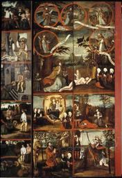 | Keywords: MCC-42054 Veelluik met het martelaarschap van de H. Theodosia (5).jpg Artwork nl Anonymous Gelre nl Middenstuk 1 Theodosia verzoekt toelating tot de gevangenis Rechtsboven een engel met banderol waarop de tekst Ghi sijt verhoert die geve die ghi do bidt heb ick gevestigt mit mijnen gelt die martelie te liden 2 Theodosia wordt bij de magistraat ter verantwoording geroepen Op het tekstbord Desen s alch sal ick mitter hulpen des heren voer s en 3 Theodosia ™s marteling aan de hefboom Op het tekstbord Ic ben bereyd dinc voer iezus christo te liden 4a Theodosia aan de schandpaal 4b Theodosia ™s ledematen worden uitgerekt 5 Allegorische voorstelling Christus aan het kruis met het offerlam op zijn schouders; onder het kruis negen schapen Op de voorgrond links een non rechts koning David met een gouden kroon op zijn hoofd en een herdersstaf met schep in beide handen die hij naar de non uitsteekt; tussen hen in ligt een harp Op het tekstbord suster hoede die scapen dier gedacten in die minne des brudegoms iesus opten berch caluarie 6a Theodosia uit het water gered door twee engelen 6b Vijf nonnen en een vrouw in wereldse kledij bezoeken Theodosia in de gevangenis Op het tekstbord min medes elen in cro Christo den enge w ech Het opschrift op de lijst onder de voorstelling is onleesbaar 7 Theodosia voor de wilde dieren geworpen Op het tekstbord nu suldi bekennen hoe vol si vermogen die god mit pueren herten minnen 8 Onthoofding van Theodosia Op het tekstbord dat ic inren tiit des vreden heb vercregen dat sal ic inden striit nie verliesen 9a Verschijning van Theodosia aan haar ouders Op het tekstbord sieh hoe soet die glorie ist daer du mi af beroeven wolste 9b Begrafenis van Theodosia Een zwevende engel met banderol waarop si heft nu salighe vrocht Aan weerszijden van deze taferelen zijn vrouwelijke heiligen afgebeeld steeds twee aan twee met tussen hen in een geknielde non Op de eerste voorstelling links in plaats van een vrouwelijke heilige Maria met kind Links 10a Madonna op de maansikkel en Fides Opschriften / fides 10b Caritas en Spes Opschriften niet leesbaar 11a Agatha en Dorothea Opschriften aghata / doratea 11b Apollonia met attribuut van Agatha tang waarin in plaats van een tand een borst is geklemd en Euphrosia Opschriften appolonia / effrosia 12a Anatolia en Christina Opschriften anatolia / 12b Victoria en Sophia Opschriften victoria / sophia Rechts 13a Margaretha en Gertrudis Opschriften a gretha / gertrudis 13b Ursula en Walburga Opschriften ursula / 14a Catharina en Barbara Opschriften katrina / barbara 14b Agnes en Prisca Opschriften agneta / priska 15a Cecilia en Cunera Opschriften cecilia / cunera 15b Lucia en Clara Opschriften lucia / clara Binnenzijde linkerluiken 16 Kruisdraging met Veronica en Simon van Cyrene 17 Doornenkroning Rechts een als priester geklede heilige met een kelk in de hand en een knielende non 18 Geseling Rechts een H Bisschop 19 Christus in de Hof van Olijven en de stigmatisatie van de Franciscus 20 Besnijdenis Rechts een reguliere kanunnik en een geknielde vrouw in 16de-eeuwse kledij met de attributen van de H Goedele een lantaarn geflankeerd door een engel met een brandende kaars en een duivel met een blaasbalg; daaronder het opschrift gudila 21 Ontkleding van Christus Rechts een heilige met een boek en een ladder 22 Kruisnageling Rechts de apostel Thomas 23 Christus aan het kruis met Maria Johannes en de drie vrouwen Rechts Antonius 24 Bewening Rechts de apostel Paulus en twee geknielde nonnen 25 Christus treedt de wijnpers Links Augustinus rechts een reguliere kanunnik Binnenzijde rechterluiken 26 Aanbidding der koningen 27 Geboorte van Christus Opschrift gloria in excelsis 28a Visitatie 28b Vier nonnen knielend voor een altaar waarop een drieluik met de Kruisiging Achter hen een priester Boven diens hoofd h ia Rechts daarvan een banderol met eenregelige tekst van een lied adv i g i I Fi Filius dn domini 29 Annunciatie Opschrift ave gratia plena 30 Genadestoel Rechtsonder op de voorgrond knielt een non Op het tekstbord god die alle creatueren gescapen heft en ons mit sin dierbaren bloet verlost heft hi wil ock sin gracie geuen ge eit v an der oude naam van de stichtster-non 31 Christus verschijnt aan Maria 32 Hemelvaart van Christus 33 Kroning van Maria 34 Allegorische voorstelling God de Vader gezeten op een troon met op de trappen die naar de troon voeren links de vijf wijze rechts de vijf dwaze maagden; in het midden een engel boven de hellemond met drie verdoemden Op de banderol in de linkerhand van de engel Gae t of Myt ghi vermadi vermaledijden ; op de banderol in zijn rechterhand coemt ghi gebenedide Op het tekstbord bij de wijze maagden gaet tot der gene daer se te coop is Op het tekstbord bij de dwaze maagden geft ons den olie vor ons lamp Op de banderol aan de onderzijde van de voorstelling rick der hemelen sal worden all fiere maechden Buitenzijde linkerluiken Nr 35 36 en 40 t/m 44 zijn gewijd aan de zeven vallen van Christus De voorstellingen zijn zeer verwant aan zeven houtsneden met dit thema gedrukt op één blad getiteld ˜O mensch betracht dy siben vell Christi und dy siben herzenlaydt Marie ™ Wenen Albertina inv nr 1930-70 Zuid-Duitsland ca 1480; zie Marrow 1979 p 82 89 100 106 131 170 pl VIII 35 Christus ™ val voor de kruisnageling zesde val 36 Kruisoprichting zevende val 37 Allegorische voorstelling Christus als Man van Smarten en gebonden aan de geselpaal houdt een rood koord vast dat verbonden is met een knielende non Tekstrol Christus o dochter vollighet my want ic gepassijt bin voor di wilt mij u hert geven om ewich te leuen Tekstrol non here ic offer u myn hert nu ende inder ewicheit Achter de non zeven kleinere opschriften verwijzend naar zeven deugden elk voorafgegaan door een hand met een geselroede waarvan de eerste en de derde onleesbaar zijn 2 die mel it mildheid ; 4 gehoorsamheijt; 5 wakinge; 6 silencia ; 7 arheyt waarheid 38 Allegorische voorstelling In een ommuurde tuin slaat Christus met een hamer op