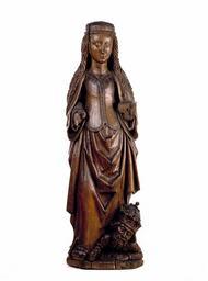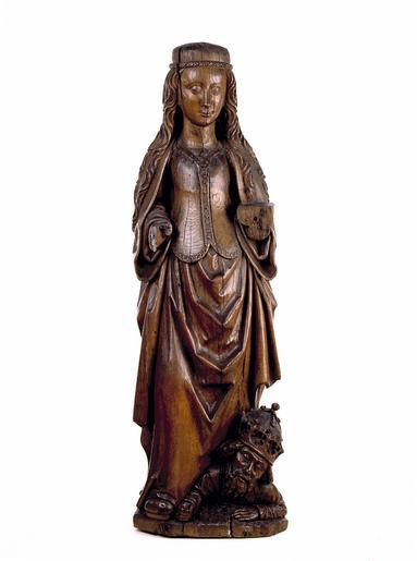 | Keywords: MCC-42290 Catharina van Alexandrië (1).tif Artwork nl Meester van Leende Noord-Brabant nl Catharina staat met haar linkervoet op keizer Maxentius terwijl ze de rechter iets naar voren heeft geplaatst In de nu verdwenen opgeheven rechterhand zal ze een zwaard hebben gedragen op de nu verdwenen linker lag een gesloten boek De keizer steunt op zijn linkerarm In zijn vooruitgestoken rechterhand hield hij een nu verdwenen scepter In zijn geopende mond zijn zijn tanden zichtbaar Catharina draagt een bovenkleed met rechte hals waarvan de boord een zigzagpatroon vertoont Over het bovenkleed ligt een keurslijf met v-hals middenband met bloemversiering en rond uitlopende panden De zoom van het keurslijf lijkt gefestonneerd Het bovenkleed heeft wijde mouwen waarin nauwe mouwen van een onderkleed zichtbaar zijn Over haar schouders ligt een mantel die zij aan weerszijden onder haar armen samen met de rok van het bovenkleed heeft opgenomen Hierdoor is een regelmatige afwisseling van driehoeksplooien en pijpplooien ontstaan Haar loshangende haren worden op het hoofd samengehouden door een getorste sierband waarop een nu verdwenen kroon rustte Aan haar rechtervoet een schoen met stompe neus De keizer draagt een kroon met gekruiste banden en fleurons en een overkleed met brede bontkraag De figuren zijn geplaatst op een met fijne groeven aangeduid grondje Sporen van polychromie Sporen witte grond Helderrood op het bovenkleed van Catharina links aan de binnenzijde van haar mantel op zwartblauw in haar haar en in de mond van de keizer en op zijn bontkraag Rechts van de keizer op het grondje een rest groen In een scheur van Catharina's kleed boven het hoofd van de keizer een rest blauw Techniek Het stuk is aan de achterzijde uitgehold uitgezonderd het hoofd en de grond In de uitholling brede gutssporen en links aan de zijkant onderaan dwarse gutssporen Langs de uitholling minstens zes gaten met resten van spijkers voormalige afdichting De kern lag midden in het werkblok NB de onderzijde kon niet worden bekeken In het standvlak een rondgat tot in de uitholling ca 1 5 cm doorsn Bij beide figuren zijn pupillen en iris ingesneden De rand van het hoofd boven de sierband is afgewerkt met een ondiep zigzagpatroon uitgezonderd het deel geheel achteraan in het midden Boven op het hoofd enkele kleine inkepingen Boven de uitholling een vierkant gesmeed oog Een noest in de schoen en daaronder Staat Onder het beeld zijn drie spieën aangebracht om het recht te laten staan De boezem is gekuist De versierde band is daarna ter hoogte van de boezem grof bijgesneden Een overlangse invoeging in de rechterschouder van de keizer Ontbreken de kroon en het zwaard van Catharina; de scepter van de keizer Afgebroken vrijwel de gehele rechterhand van Catharina restanten bijgezaagd; afgebroken spijkers naast de duim en in de middelvinger en ringvinger; de linkerhand van Catharina met het attribuut daarop bijgezaagd; in het vlak twee gaten met restanten van spijkers; dit vlak is voorzien van golvende ingekraste lijntjes voor lijmhechting ; enkele fleurons van de kroon van de keizer; aan de achterzijde links een kleine beschadiging in het haar van Catharina Radiale scheuren door het hoofd van Catharina; lichte scheuren aan de voorzijde over de gehele lengte; grote scheur in de grond bij de keizer noest ; grote scheuren boven het hoofd van de keizer in het kleed Links in de plooi van het kleed een geoxydeerd gat Enkele houtwormgaatjes in de achterzijde links en in beide zijkanten between 1495 1504 nl eikenhout verf Size 101 0 32 5 cm nl Hoogte 101 0cm Breedte 32 5cm Diepte 23 0cm Institution Museum Catharijneconvent object history exhibition history credit line nl Foto Museum Catharijneconvent Utrecht foto Ruben de Heer accession number Object number 42290 Inventory number ABM bh00274 place of creation https //www catharijneconvent nl/adlib/42290/ View this work on the website of Museum Catharijneconvent Museum Catharijneconvent Cc-zero <gallery> File MCC-42290_Catharina_van_Alexandrië_ 1 tif </gallery> Uncategorized 2015 March 1 |