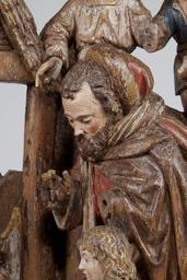 | Keywords: MCC-42318 Geboorte van Christus, aanbidding der herders (8).tif Artwork nl Anonymous Utrecht nl Voor een vervallen stal in het midden van de voorstelling knielt Maria links in aanbidding neer bij het kindje dat in het stro ligt Ook zijn twee engelen bij het kind neergeknield De ene en profil rechts op de voorgrond bespeelt een harp die hij voor zich houdt De andere zit schuin achter het kindje rechts van Maria en heeft zijn handen gevouwen voor zich Achter de harpspelende engel staat Jozef driekwart naar links gewend Hij kijkt wat voorovergebogen op het kind neer In zijn verdwenen linkerhand droeg hij waarschijnlijk een kaars waarvan hij het licht met zijn geheven rechter hand afschermde tegen de stralen die van het kind uitgaan Op de achtergrond rechts boven op een rots of heuvel staat een derde engel die met zijn rechterhand het kind aanwijst aan een klein afgebeelde herder die rechts naast hem loopt In de stal achter een met leem bestreken tenen wand kijkt nog een herder toe waarvan alleen het hoofd en de schouders zichtbaar zijn Het dak van de stal rust op vier pilaren In de voorzijde ervan is een rechthoekig venster aangebracht waarin twee duifjes zitten Tussen de twee linkerpilaren door hebben de os en de ezel hun koppen naar buiten gestoken Terwijl de os naar voren kijkt neemt de ezel een flinke hap stro uit de kribbe die voor hem staat Het linker gedeelte van de voorstelling wordt ingenomen door een grote rotsige heuvelpartij waarvoor een herder staat Hij heeft zijn bovenlichaam bijna en profil naar rechts gedraaid en zijn linkerbeen iets naar voren geplaatst en kijkt naar het geboortetafereel Hij leunt met beide handen op een herdersstaf die aan de onderzijde voorzien is van een schep De heuvelige bodem is afgewerkt met zigzaggroeven Maria draagt een lang gewaad Haar mantel is van haar rechterschouder gegleden tot op haar heupen en bedekt in soepele plooien de grond Haar kleed heeft omgeslagen mouwboorden Over haar hoofd een deels teruggeslagen sluier De engelen zijn gekleed in gegorde albes De achterste engel heeft een diadeem op het hoofd Aan de gordel rond Jozefs kleed hangt een rozenkrans Zijn mantel is teruggeslagen over zijn linker schouder Op zijn hoofd een kaproenachtig hoofddeksel en om zijn hals een grote sjaal De herder rechts op de achtergrond heeft een hoed met opgeslagen achterrand op het hoofd Hij draagt een korte gegorde tuniek met v-hals Aan zijn riem hangen een tas en een hoornachtig voorwerp Hij heeft puntig schoeisel en zijn kousen lijken afgerold Van de herder achter de wand is alleen te zien dat hij een kap draagt De linker herder is gekleed in een korte gegorde tuniek met kort ingesneden wambuis en lage schoenen met afgeronde neus Op zijn hoofd een hoed waar aan de linkerkant een doek onderuit hangt Zijn handen zijn in wanten gestoken Polychromie Het stuk is deels bedekt met oude maar niet oorspronkelijke polychromie De bruine retouches van de witte grond en de lacunes maken het moeilijk nog onderliggende lagen te onderscheiden Het stuk lijkt grondig schoongemaakt voordat het opnieuw is gestoffeerd Incarnaat lichtroze met rode blossen De herders vertonen een oranje-achtig incarnaat De ogen zijn gedetailleerd in zwart en bruin; monden helderrood Maria's haar is bruin haar sluier en binnenkant van de mantel blauw; buitenzijden mantel deels rood deels blauw verkeerd geïnterpreteerd door de stoffeerder ; gewaad rood met vergulde boorden De matte vergulding lijkt op een gelige grond te liggen De albes van de engelen zijn roze Hun haar matverguld op een gelige grond De harp is verguld De boorden van de albes zijn verguld Jozef haar bruin rand van de hoed verguld op gelige grond; slip rood; sjaal wit; kleed en rozenkrans rood; mantel bruin Kleine herder hoed rood; haar donkerbruin waaronder resten van oranjerood bolus ; kleed blauw; hoorn gordel en tas gelig; kousen en schoenen donkerrood Kap herder blauw met een witte rand Os rood tanden wit hoorns roze Ezel lichtbruin Stro geel Ruif lichtbruin waarop donkerbruin Herder links hoed blauw met rode slip; wambuis bruin met rode kraag manchetten en split; tuniek blauw waarop sporen vergulding; buidel lichtgeel; kousen wit; schoenen donkerbruin Onder het wit van de kousen mogelijk roze incarnaat Staf lichtbruin met blauwe schep Stal zuilen en achterwand rechts donkerbruin; strodak geelbruin; gevel donkerbruin met witte duifjes waarvan er een een rode snavel heeft; wand blauw; vleugels middelste geknielde engel wit met vergulde rand Heuvels resten geel bruin en groen Het geel ligt deels over het groen Rotsen links bovenaan heel lichtroze waaronder vergulding op rood-achtige bolus Techniek De groep is uit meerdere delen samengesteld Het rechtergedeelte met de stal Maria Jozef en de engelen vormt één geheel uitgezonderd de rechts op de voorgrond knielende engel en het kindje op het stro De kern lag achter het werkblok Aan dit gedeelte zijn toegevoegd het rechterduifje in de stal genoemd kindje en engel en de grond onder de engel De figuren op de voorgrond zijn rondom bewerkt Het linkergedeelte met de rotsen en de grote herderfiguur vormt één geheel De herder is bijna rondom uitgewerkt De twee delen zijn aan elkaar gezet door middel van houten pennen en verbindingsplankjes die met grote nagels in de onderzijde van de delen zijn bevestigd Ook bovenaan de achterzijde bevindt zich een origineel verbindingsplankje vastgezet met zes gesmede nagels twee verdwenen Mogelijk liep dit plankje verder door naar links waar nog twee gesmede nagels aanwezig zijn Een deel van de grond tussen beide delen vormt eveneens een verbinding en is met twee houten pennen en een ijzeren nagel in de voorzijde vastgezet De grond onder de engel is met houten pennen en een metalen nagel bevestigd Het kind is op de grond gelijmd en ingepend De harp bestaat uit twee delen De linkerhand van de linkerengel vormt één geheel met de snaren De delen lijken gelijmd en daarna met een grote nagel onderaan in de engel vastgezet Het rechter duifj
