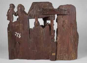 | Keywords: MCC-42318 Geboorte van Christus, aanbidding der herders (2).tif Artwork nl Anonymous Utrecht nl Voor een vervallen stal in het midden van de voorstelling knielt Maria links in aanbidding neer bij het kindje dat in het stro ligt Ook zijn twee engelen bij het kind neergeknield De ene en profil rechts op de voorgrond bespeelt een harp die hij voor zich houdt De andere zit schuin achter het kindje rechts van Maria en heeft zijn handen gevouwen voor zich Achter de harpspelende engel staat Jozef driekwart naar links gewend Hij kijkt wat voorovergebogen op het kind neer In zijn verdwenen linkerhand droeg hij waarschijnlijk een kaars waarvan hij het licht met zijn geheven rechter hand afschermde tegen de stralen die van het kind uitgaan Op de achtergrond rechts boven op een rots of heuvel staat een derde engel die met zijn rechterhand het kind aanwijst aan een klein afgebeelde herder die rechts naast hem loopt In de stal achter een met leem bestreken tenen wand kijkt nog een herder toe waarvan alleen het hoofd en de schouders zichtbaar zijn Het dak van de stal rust op vier pilaren In de voorzijde ervan is een rechthoekig venster aangebracht waarin twee duifjes zitten Tussen de twee linkerpilaren door hebben de os en de ezel hun koppen naar buiten gestoken Terwijl de os naar voren kijkt neemt de ezel een flinke hap stro uit de kribbe die voor hem staat Het linker gedeelte van de voorstelling wordt ingenomen door een grote rotsige heuvelpartij waarvoor een herder staat Hij heeft zijn bovenlichaam bijna en profil naar rechts gedraaid en zijn linkerbeen iets naar voren geplaatst en kijkt naar het geboortetafereel Hij leunt met beide handen op een herdersstaf die aan de onderzijde voorzien is van een schep De heuvelige bodem is afgewerkt met zigzaggroeven Maria draagt een lang gewaad Haar mantel is van haar rechterschouder gegleden tot op haar heupen en bedekt in soepele plooien de grond Haar kleed heeft omgeslagen mouwboorden Over haar hoofd een deels teruggeslagen sluier De engelen zijn gekleed in gegorde albes De achterste engel heeft een diadeem op het hoofd Aan de gordel rond Jozefs kleed hangt een rozenkrans Zijn mantel is teruggeslagen over zijn linker schouder Op zijn hoofd een kaproenachtig hoofddeksel en om zijn hals een grote sjaal De herder rechts op de achtergrond heeft een hoed met opgeslagen achterrand op het hoofd Hij draagt een korte gegorde tuniek met v-hals Aan zijn riem hangen een tas en een hoornachtig voorwerp Hij heeft puntig schoeisel en zijn kousen lijken afgerold Van de herder achter de wand is alleen te zien dat hij een kap draagt De linker herder is gekleed in een korte gegorde tuniek met kort ingesneden wambuis en lage schoenen met afgeronde neus Op zijn hoofd een hoed waar aan de linkerkant een doek onderuit hangt Zijn handen zijn in wanten gestoken Polychromie Het stuk is deels bedekt met oude maar niet oorspronkelijke polychromie De bruine retouches van de witte grond en de lacunes maken het moeilijk nog onderliggende lagen te onderscheiden Het stuk lijkt grondig schoongemaakt voordat het opnieuw is gestoffeerd Incarnaat lichtroze met rode blossen De herders vertonen een oranje-achtig incarnaat De ogen zijn gedetailleerd in zwart en bruin; monden helderrood Maria's haar is bruin haar sluier en binnenkant van de mantel blauw; buitenzijden mantel deels rood deels blauw verkeerd geïnterpreteerd door de stoffeerder ; gewaad rood met vergulde boorden De matte vergulding lijkt op een gelige grond te liggen De albes van de engelen zijn roze Hun haar matverguld op een gelige grond De harp is verguld De boorden van de albes zijn verguld Jozef haar bruin rand van de hoed verguld op gelige grond; slip rood; sjaal wit; kleed en rozenkrans rood; mantel bruin Kleine herder hoed rood; haar donkerbruin waaronder resten van oranjerood bolus ; kleed blauw; hoorn gordel en tas gelig; kousen en schoenen donkerrood Kap herder blauw met een witte rand Os rood tanden wit hoorns roze Ezel lichtbruin Stro geel Ruif lichtbruin waarop donkerbruin Herder links hoed blauw met rode slip; wambuis bruin met rode kraag manchetten en split; tuniek blauw waarop sporen vergulding; buidel lichtgeel; kousen wit; schoenen donkerbruin Onder het wit van de kousen mogelijk roze incarnaat Staf lichtbruin met blauwe schep Stal zuilen en achterwand rechts donkerbruin; strodak geelbruin; gevel donkerbruin met witte duifjes waarvan er een een rode snavel heeft; wand blauw; vleugels middelste geknielde engel wit met vergulde rand Heuvels resten geel bruin en groen Het geel ligt deels over het groen Rotsen links bovenaan heel lichtroze waaronder vergulding op rood-achtige bolus Techniek De groep is uit meerdere delen samengesteld Het rechtergedeelte met de stal Maria Jozef en de engelen vormt één geheel uitgezonderd de rechts op de voorgrond knielende engel en het kindje op het stro De kern lag achter het werkblok Aan dit gedeelte zijn toegevoegd het rechterduifje in de stal genoemd kindje en engel en de grond onder de engel De figuren op de voorgrond zijn rondom bewerkt Het linkergedeelte met de rotsen en de grote herderfiguur vormt één geheel De herder is bijna rondom uitgewerkt De twee delen zijn aan elkaar gezet door middel van houten pennen en verbindingsplankjes die met grote nagels in de onderzijde van de delen zijn bevestigd Ook bovenaan de achterzijde bevindt zich een origineel verbindingsplankje vastgezet met zes gesmede nagels twee verdwenen Mogelijk liep dit plankje verder door naar links waar nog twee gesmede nagels aanwezig zijn Een deel van de grond tussen beide delen vormt eveneens een verbinding en is met twee houten pennen en een ijzeren nagel in de voorzijde vastgezet De grond onder de engel is met houten pennen en een metalen nagel bevestigd Het kind is op de grond gelijmd en ingepend De harp bestaat uit twee delen De linkerhand van de linkerengel vormt één geheel met de snaren De delen lijken gelijmd en daarna met een grote nagel onderaan in de engel vastgezet Het rechter duifj