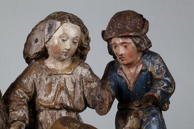 | Keywords: MCC-42318 Geboorte van Christus, aanbidding der herders (10).tif Artwork nl Anonymous Utrecht nl Voor een vervallen stal in het midden van de voorstelling knielt Maria links in aanbidding neer bij het kindje dat in het stro ligt Ook zijn twee engelen bij het kind neergeknield De ene en profil rechts op de voorgrond bespeelt een harp die hij voor zich houdt De andere zit schuin achter het kindje rechts van Maria en heeft zijn handen gevouwen voor zich Achter de harpspelende engel staat Jozef driekwart naar links gewend Hij kijkt wat voorovergebogen op het kind neer In zijn verdwenen linkerhand droeg hij waarschijnlijk een kaars waarvan hij het licht met zijn geheven rechter hand afschermde tegen de stralen die van het kind uitgaan Op de achtergrond rechts boven op een rots of heuvel staat een derde engel die met zijn rechterhand het kind aanwijst aan een klein afgebeelde herder die rechts naast hem loopt In de stal achter een met leem bestreken tenen wand kijkt nog een herder toe waarvan alleen het hoofd en de schouders zichtbaar zijn Het dak van de stal rust op vier pilaren In de voorzijde ervan is een rechthoekig venster aangebracht waarin twee duifjes zitten Tussen de twee linkerpilaren door hebben de os en de ezel hun koppen naar buiten gestoken Terwijl de os naar voren kijkt neemt de ezel een flinke hap stro uit de kribbe die voor hem staat Het linker gedeelte van de voorstelling wordt ingenomen door een grote rotsige heuvelpartij waarvoor een herder staat Hij heeft zijn bovenlichaam bijna en profil naar rechts gedraaid en zijn linkerbeen iets naar voren geplaatst en kijkt naar het geboortetafereel Hij leunt met beide handen op een herdersstaf die aan de onderzijde voorzien is van een schep De heuvelige bodem is afgewerkt met zigzaggroeven Maria draagt een lang gewaad Haar mantel is van haar rechterschouder gegleden tot op haar heupen en bedekt in soepele plooien de grond Haar kleed heeft omgeslagen mouwboorden Over haar hoofd een deels teruggeslagen sluier De engelen zijn gekleed in gegorde albes De achterste engel heeft een diadeem op het hoofd Aan de gordel rond Jozefs kleed hangt een rozenkrans Zijn mantel is teruggeslagen over zijn linker schouder Op zijn hoofd een kaproenachtig hoofddeksel en om zijn hals een grote sjaal De herder rechts op de achtergrond heeft een hoed met opgeslagen achterrand op het hoofd Hij draagt een korte gegorde tuniek met v-hals Aan zijn riem hangen een tas en een hoornachtig voorwerp Hij heeft puntig schoeisel en zijn kousen lijken afgerold Van de herder achter de wand is alleen te zien dat hij een kap draagt De linker herder is gekleed in een korte gegorde tuniek met kort ingesneden wambuis en lage schoenen met afgeronde neus Op zijn hoofd een hoed waar aan de linkerkant een doek onderuit hangt Zijn handen zijn in wanten gestoken Polychromie Het stuk is deels bedekt met oude maar niet oorspronkelijke polychromie De bruine retouches van de witte grond en de lacunes maken het moeilijk nog onderliggende lagen te onderscheiden Het stuk lijkt grondig schoongemaakt voordat het opnieuw is gestoffeerd Incarnaat lichtroze met rode blossen De herders vertonen een oranje-achtig incarnaat De ogen zijn gedetailleerd in zwart en bruin; monden helderrood Maria's haar is bruin haar sluier en binnenkant van de mantel blauw; buitenzijden mantel deels rood deels blauw verkeerd geïnterpreteerd door de stoffeerder ; gewaad rood met vergulde boorden De matte vergulding lijkt op een gelige grond te liggen De albes van de engelen zijn roze Hun haar matverguld op een gelige grond De harp is verguld De boorden van de albes zijn verguld Jozef haar bruin rand van de hoed verguld op gelige grond; slip rood; sjaal wit; kleed en rozenkrans rood; mantel bruin Kleine herder hoed rood; haar donkerbruin waaronder resten van oranjerood bolus ; kleed blauw; hoorn gordel en tas gelig; kousen en schoenen donkerrood Kap herder blauw met een witte rand Os rood tanden wit hoorns roze Ezel lichtbruin Stro geel Ruif lichtbruin waarop donkerbruin Herder links hoed blauw met rode slip; wambuis bruin met rode kraag manchetten en split; tuniek blauw waarop sporen vergulding; buidel lichtgeel; kousen wit; schoenen donkerbruin Onder het wit van de kousen mogelijk roze incarnaat Staf lichtbruin met blauwe schep Stal zuilen en achterwand rechts donkerbruin; strodak geelbruin; gevel donkerbruin met witte duifjes waarvan er een een rode snavel heeft; wand blauw; vleugels middelste geknielde engel wit met vergulde rand Heuvels resten geel bruin en groen Het geel ligt deels over het groen Rotsen links bovenaan heel lichtroze waaronder vergulding op rood-achtige bolus Techniek De groep is uit meerdere delen samengesteld Het rechtergedeelte met de stal Maria Jozef en de engelen vormt één geheel uitgezonderd de rechts op de voorgrond knielende engel en het kindje op het stro De kern lag achter het werkblok Aan dit gedeelte zijn toegevoegd het rechterduifje in de stal genoemd kindje en engel en de grond onder de engel De figuren op de voorgrond zijn rondom bewerkt Het linkergedeelte met de rotsen en de grote herderfiguur vormt één geheel De herder is bijna rondom uitgewerkt De twee delen zijn aan elkaar gezet door middel van houten pennen en verbindingsplankjes die met grote nagels in de onderzijde van de delen zijn bevestigd Ook bovenaan de achterzijde bevindt zich een origineel verbindingsplankje vastgezet met zes gesmede nagels twee verdwenen Mogelijk liep dit plankje verder door naar links waar nog twee gesmede nagels aanwezig zijn Een deel van de grond tussen beide delen vormt eveneens een verbinding en is met twee houten pennen en een ijzeren nagel in de voorzijde vastgezet De grond onder de engel is met houten pennen en een metalen nagel bevestigd Het kind is op de grond gelijmd en ingepend De harp bestaat uit twee delen De linkerhand van de linkerengel vormt één geheel met de snaren De delen lijken gelijmd en daarna met een grote nagel onderaan in de engel vastgezet Het rechter duif