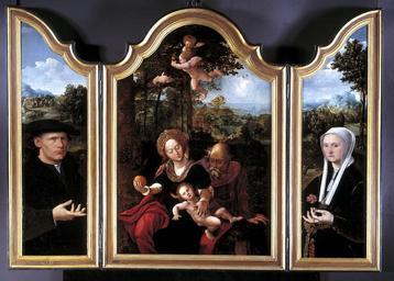 | Keywords: MCC-42518 Drieluik met Rust op de vlucht naar Egypte (1).tif Artwork nl Dirck Jacobsz Pieter I Coecke van Aelst nl Het middenpaneel toont Maria zittend met het Christuskind voor een bomengroep in een bergachtig landschap Met de linker hand houdt zij het spartelende Christuskind vast dat tegen haar aan ligt en in haar rechter hand houdt zij een appel Achter Maria kijkt Jozef toe Hij steunt op zijn linker hand en heeft zijn rechter hand op Maria's schouder gelegd Boven de heilige familie zweven drie gevleugelde putti tussen de bladeren van de bomen Op het middenplan graast de ezel Op de zijpanelen is een stichterspaar afgebeeld in een bosrijk heuvellandschap met op de achtergrond een stad Links de man in halffiguur driekwart naar rechts Hij kijkt naar de beschouwer en maakt met zijn rechter hand een spreekgebaar Hij draagt een paltrok en tabbaard en op het hoofd een platte baret met oorkleppen Rechts de vrouw in halffiguur driekwart naar links Zij kijkt eveneens naar de beschouwer en heeft een anjer in haar linker hand Zij draagt over een fluwelen gewaad een overkleed met wijde mouwen en om haar middel een rijk gedecoreerde gouden ketting met een gesp waaraan een roodkoralen rozenkrans hangt Op het hoofd heeft zij een witte kap met lange witte slippen die op haar borst hangen Op de lijst van het linkerluik een incompleet jaartal 153 between 1530 1539 nl paneel olieverf nl Hoogte 103 0cm Breedte 71 0cm Hoogte 117 5cm Breedte 83 5cm Hoogte 104 5cm Breedte 29 5cm Hoogte 117 5cm Breedte 41 5cm Max hoogte 121 5cm Max breedte 84 0cm Max diepte 9 0cm Institution Museum Catharijneconvent object history exhibition history credit line nl Foto Museum Catharijneconvent Utrecht foto Ruben de Heer accession number Object number 42518 Inventory number ABM s00067 place of creation https //www catharijneconvent nl/adlib/42518/ View this work on the website of Museum Catharijneconvent Museum Catharijneconvent Cc-zero <gallery> File MCC-42518_Drieluik_met_Rust_op_de_vlucht_naar_Egypte_ 3 tif File MCC-42518_Drieluik_met_Rust_op_de_vlucht_naar_Egypte_ 2 tif File MCC-42518_Drieluik_met_Rust_op_de_vlucht_naar_Egypte_ 4 tif File MCC-42518_Drieluik_met_Rust_op_de_vlucht_naar_Egypte_ 1 tif </gallery> |