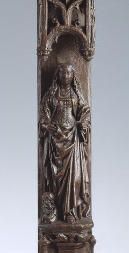 Keywords: MCC-42808 Deurnaald met Johannes de Doper en Catharina van Alexandrië, elk op een console onder een baldakijn (3).tif Artwork nl Anonymous Utrecht nl De deurnaald is aan de voorzijde gedecoreerd met de heiligen Johannes de Doper en Catharina onder laatgotische baldakijnen boven een hoge met pinakels gedecoreerde onderzone Johannes de Doper is aan het bovenuiteinde aangebracht Hij is frontaal weergegeven rustend op zijn rechterbeen Hij heeft zijn gezicht driekwart naar rechts gewend en wijst met zijn rechterhand op zijn attribuut het lam Het lam ligt naar links gewend op een boek dat de heilige in zijn linkerhand houdt Johannes is gehuld in een mantel die over beide schouders ligt De mantel is onder zijn rechterarm door getrokken en over zijn linkerschouder gevoerd Het andere uiteinde hangt af van zijn linkerarm Hij draagt een kleed waarin een opstaande kraag van een onderkleed zichtbaar is Tussen zijn benen hangt een slip van het gewaad naar beneden en over de grond Hij is blootsvoets Zijn gezicht is omgeven door wijd uitstaande haren zijn baard is gespleten Boven zijn hoofd een ajour bewerkt baldakijn met in- en uitzwenkende geprofileerde randen en kleine hogels In het midden een vooruitspringende pinakel Ook aan weerszijden pinakels De bovenzijde van het baldakijn waarachter een kwartholprofiel begint lijkt ingekort Hij staat op een overhoeks gestelde sokkel die een met bladeren versierd kapiteel met profielranden heeft De zijden van de sokkel vertonen roodboognissen De sokkel rust op het baldakijn van het Catharinabeeldje dat ongeveer in het midden van de deurnaald is aangebracht Catharina is frontaal weergegeven met iets vooruitgeschoven linkervoet Aan haar voeten links verschijnt het bovenlichaam van keizer Maxentius Haar verkeerd geplaatste rechterhand is tegen haar gewaad gedrukt in de gebalde linkerhand zal zij haar attribuut het zwaard hebben geklemd Catharina draagt een diadeem op haar lange golvende haar Haar mantel ligt over haar schouders en is op de borst met een dubbel koord gesloten Haar bovenkleed heeft een ronde hals waarin een hemd met v-hals zichtbaar is De nauwsluitende keurs is voorzien van een verticale reeks vierkante versieringen De wijde rok heeft zij onder beide armen opgenomen en over haar linkerarm extra hoog opgetrokken Links van het midden is hierdoor een reeks onregelmatige plooien ontstaan rechts een bundel pijpplooien Onder de rok is het wijde onderkleed zichtbaar en haar in een trip gestoken linkerschoen met stompe neus De keizer heeft zich driekwart naar links gedraaid Hij steunt met zijn rechter onderarm op de sokkel In zijn rechterhand hield hij waarschijnlijk een nu verdwenen scepter Hij is driekwart naar links weergegeven het gezicht frontaal Hij heeft een tulband op het hoofd en draagt een bovenkleed met bloezende mouwen en schouderkraag of mantel Zijn brede baard is gespleten Boven Catharina hangt een ajour bewerkt baldakijn dat aan de voorzijde wordt afgesloten door een ronde driepasboog aan de zijkanten door spitse driepasbogen Op de hoeken pinakels op hangende kraagstenen waartussen golvende tracering met hogels die aan de bovenzijde tegen de overhoeks geplaatste sokkel van Johannes rust De figuren rusten op een veelkantige sokkel met bladversiering tussen geprofileerde lijsten Deze sokkel lijkt te rusten op twee overhoeks gestelde spitsbogen met hogels en kruisbloemen die in het midden rusten op een colonnet met halsring en bladkapiteel Bijna onderaan de colonet oorspronkelijk waarschijnlijk ongeveer in het midden een tweede ring Onder beide bogen een lange pinakel Techniek In het midden van de deurnaald bevindt zich aan de achterzijde een halfronde uitholling Waarschijnlijk is dit het restant van een boorgat waarin een wig werd gedreven om het werkblok te splijten Op de plaats waar dit restant van het boorgat zichtbaar was namelijk in de strook die over de naad tussen de deuren sloot is het boorgat gedicht met een rechthoekig blokje hout De deurnaald is op een rechterdeur gepend geweest de achterzijde van het rechtergedeelte is minder verkleurd dan het linker en vertoont vier pengaten doorsn ca 1 cm Staat De deurnaald is oorspronkelijk langer geweest Hij is aan de bovenzijde en onderzijde ingekort De halsringen van de onderzone hebben mogelijk ter halver hoogte van de colonetten gezeten die zelf weer op een geprofileerde plint gestaan zullen hebben De oorspronkelijke hoogte zal ca 2 m zijn geweest De bovenafsluiting is waarschijnlijk ook langer geweest De versiering boven het baldakijn van Johannes zal hoger zijn geweest afgezaagd De onderkant is vrij lang geleden afgezaagd en daarna nog weer aan vocht blootgesteld geweest In de achterzijde een later aangebrachte verticale groef waarin resten van naaldhout en lijmsporen hergebruik Een deel van de gewaadslip van Johannes is bijgezaagd met de voorzijde van de sokkel Idem een deel van het gewaad op zijn linkerknie De rechterhand van Johannes is niet origineel of bijgewerkt De mantelsip en het uiteinde van de mouw zijn bijgesneden Het proportioneel gezien veel te kleine en te hoog geplaatste handje is ingestoken De mantelplooi recht onder het lam is afgebroken en bijgesneden Het rechterhandje van Catharina lijkt niet origineel Het is grover dan het linker en de positie is verkeerd het lijkt alsof een slip van de keding wordt gesteund Oorspronkelijk zal Catharina echter een boek op de rechterhand hebben gedragen Het hoofd van Catharina lijkt bijgezaagd en vertoont een cirkelvormige groef nu gestopt met was waarin t t v de aankoop een modern metalen kroontje was geplaatst De onderste twee halsringen van de kolonetten links en midden zijn los ingestoken reparaties De kruisbloem op de linker spitse driepasboog van de onderzone is bijgemaakt en aangezet met twee houten pennen Ontbreken de kroon en het zwaard van Catharina de scepter van de keizer Afgebroken het uiteinde van Catharina's rechtermouw een deel van de mantelplooi rechts; de linkerhand van de keizer spijker in breukvlak ; delen 