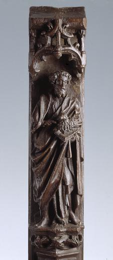 Keywords: MCC-42808 Deurnaald met Johannes de Doper en Catharina van Alexandrië, elk op een console onder een baldakijn (2).tif Artwork nl Anonymous Utrecht nl De deurnaald is aan de voorzijde gedecoreerd met de heiligen Johannes de Doper en Catharina onder laatgotische baldakijnen boven een hoge met pinakels gedecoreerde onderzone Johannes de Doper is aan het bovenuiteinde aangebracht Hij is frontaal weergegeven rustend op zijn rechterbeen Hij heeft zijn gezicht driekwart naar rechts gewend en wijst met zijn rechterhand op zijn attribuut het lam Het lam ligt naar links gewend op een boek dat de heilige in zijn linkerhand houdt Johannes is gehuld in een mantel die over beide schouders ligt De mantel is onder zijn rechterarm door getrokken en over zijn linkerschouder gevoerd Het andere uiteinde hangt af van zijn linkerarm Hij draagt een kleed waarin een opstaande kraag van een onderkleed zichtbaar is Tussen zijn benen hangt een slip van het gewaad naar beneden en over de grond Hij is blootsvoets Zijn gezicht is omgeven door wijd uitstaande haren zijn baard is gespleten Boven zijn hoofd een ajour bewerkt baldakijn met in- en uitzwenkende geprofileerde randen en kleine hogels In het midden een vooruitspringende pinakel Ook aan weerszijden pinakels De bovenzijde van het baldakijn waarachter een kwartholprofiel begint lijkt ingekort Hij staat op een overhoeks gestelde sokkel die een met bladeren versierd kapiteel met profielranden heeft De zijden van de sokkel vertonen roodboognissen De sokkel rust op het baldakijn van het Catharinabeeldje dat ongeveer in het midden van de deurnaald is aangebracht Catharina is frontaal weergegeven met iets vooruitgeschoven linkervoet Aan haar voeten links verschijnt het bovenlichaam van keizer Maxentius Haar verkeerd geplaatste rechterhand is tegen haar gewaad gedrukt in de gebalde linkerhand zal zij haar attribuut het zwaard hebben geklemd Catharina draagt een diadeem op haar lange golvende haar Haar mantel ligt over haar schouders en is op de borst met een dubbel koord gesloten Haar bovenkleed heeft een ronde hals waarin een hemd met v-hals zichtbaar is De nauwsluitende keurs is voorzien van een verticale reeks vierkante versieringen De wijde rok heeft zij onder beide armen opgenomen en over haar linkerarm extra hoog opgetrokken Links van het midden is hierdoor een reeks onregelmatige plooien ontstaan rechts een bundel pijpplooien Onder de rok is het wijde onderkleed zichtbaar en haar in een trip gestoken linkerschoen met stompe neus De keizer heeft zich driekwart naar links gedraaid Hij steunt met zijn rechter onderarm op de sokkel In zijn rechterhand hield hij waarschijnlijk een nu verdwenen scepter Hij is driekwart naar links weergegeven het gezicht frontaal Hij heeft een tulband op het hoofd en draagt een bovenkleed met bloezende mouwen en schouderkraag of mantel Zijn brede baard is gespleten Boven Catharina hangt een ajour bewerkt baldakijn dat aan de voorzijde wordt afgesloten door een ronde driepasboog aan de zijkanten door spitse driepasbogen Op de hoeken pinakels op hangende kraagstenen waartussen golvende tracering met hogels die aan de bovenzijde tegen de overhoeks geplaatste sokkel van Johannes rust De figuren rusten op een veelkantige sokkel met bladversiering tussen geprofileerde lijsten Deze sokkel lijkt te rusten op twee overhoeks gestelde spitsbogen met hogels en kruisbloemen die in het midden rusten op een colonnet met halsring en bladkapiteel Bijna onderaan de colonet oorspronkelijk waarschijnlijk ongeveer in het midden een tweede ring Onder beide bogen een lange pinakel Techniek In het midden van de deurnaald bevindt zich aan de achterzijde een halfronde uitholling Waarschijnlijk is dit het restant van een boorgat waarin een wig werd gedreven om het werkblok te splijten Op de plaats waar dit restant van het boorgat zichtbaar was namelijk in de strook die over de naad tussen de deuren sloot is het boorgat gedicht met een rechthoekig blokje hout De deurnaald is op een rechterdeur gepend geweest de achterzijde van het rechtergedeelte is minder verkleurd dan het linker en vertoont vier pengaten doorsn ca 1 cm Staat De deurnaald is oorspronkelijk langer geweest Hij is aan de bovenzijde en onderzijde ingekort De halsringen van de onderzone hebben mogelijk ter halver hoogte van de colonetten gezeten die zelf weer op een geprofileerde plint gestaan zullen hebben De oorspronkelijke hoogte zal ca 2 m zijn geweest De bovenafsluiting is waarschijnlijk ook langer geweest De versiering boven het baldakijn van Johannes zal hoger zijn geweest afgezaagd De onderkant is vrij lang geleden afgezaagd en daarna nog weer aan vocht blootgesteld geweest In de achterzijde een later aangebrachte verticale groef waarin resten van naaldhout en lijmsporen hergebruik Een deel van de gewaadslip van Johannes is bijgezaagd met de voorzijde van de sokkel Idem een deel van het gewaad op zijn linkerknie De rechterhand van Johannes is niet origineel of bijgewerkt De mantelsip en het uiteinde van de mouw zijn bijgesneden Het proportioneel gezien veel te kleine en te hoog geplaatste handje is ingestoken De mantelplooi recht onder het lam is afgebroken en bijgesneden Het rechterhandje van Catharina lijkt niet origineel Het is grover dan het linker en de positie is verkeerd het lijkt alsof een slip van de keding wordt gesteund Oorspronkelijk zal Catharina echter een boek op de rechterhand hebben gedragen Het hoofd van Catharina lijkt bijgezaagd en vertoont een cirkelvormige groef nu gestopt met was waarin t t v de aankoop een modern metalen kroontje was geplaatst De onderste twee halsringen van de kolonetten links en midden zijn los ingestoken reparaties De kruisbloem op de linker spitse driepasboog van de onderzone is bijgemaakt en aangezet met twee houten pennen Ontbreken de kroon en het zwaard van Catharina de scepter van de keizer Afgebroken het uiteinde van Catharina's rechtermouw een deel van de mantelplooi rechts; de linkerhand van de keizer spijker in breukvlak ; delen 