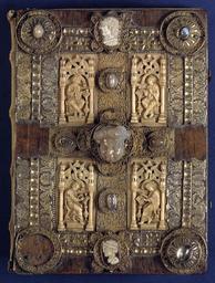 | Keywords: MCC-61050 Evangeliarium (Lebuïnuscodex) (1).jpg Artwork nl Anonymous Noordoost-Frankrijk Anonymous Rijnland Anonymous Maasland nl De kern van de boekband van de Lebuïnuscodex wordt gevormd door twee eikenhouten platten De rug en het achterplat zijn overtrokken met zeemleer Het voorplat is rijkelijk versierd met verguld zilversmeedwerk reliëfs van walrustand en verscheidene stenen De compositie van de bekleding van het voorplat wordt bepaald door een verguld zilveren filigraankruis Aan de uiteinden van de kruisarmen bevinden zich vierpassen met overhoeks vierkant eveneens met filigraan gedecoreerd Hiervan zijn er slechts twee bewaard gebleven en wel die aan de verticale kruisarmen Zij bevatten tevens nog de oorspronkelijke versiering bestaande uit een filigraanmedaillon met een pseudo-camee van respectievelijk een mannen- en een vrouwenhoofd in profiel Het snijpunt van het kruis wordt ingenomen door een ver vooruitstekend Bacchuskopje in chalcedoon te herkennen aan de kleine druiventrosjes in zijn haartooi Het kopje is gevat in een filigraanmedaillon welke op zijn beurt weer is geplaatst op een vierpas van filigraanwerk Op elk van de kruisarmen bevindt zich een ovale steen 'en cabochon' op een medaillon met filigraan Het filigraanwerk van kruis en sierstukken is in de vorm van visblazen In de ruimten tussen de kruisarmen zijn rechthoekige reliëfs van walrustand aangebracht met de vier evangelisten en hun symbool De reliëfs hebben de volgende afmetingen H 10 0 x B 5 5 cm Van links boven naar rechts onder betreft het Mattheus met de engel Johannes met de adelaar Marcus met de gevleugelde leeuw en Lucas met de gevleugelde os De figuren zijn paarsgewijs als elkaars spiegelbeeld ten opzichte van de middenas geplaatst Mattheus en Johannes zitten vrijwel geheel frontaal terwijl Marcus en Lucas meer in profiel zijn afgebeeld Qua opbouw verschillen de vier reliëfs nauwelijks van elkaar Binnen een rand van vierlobbige blaadjes verheffen zich twee zuilen met een basis een kapiteel en een dekplaat Hierop rust een rondboog geflankeerd door twee torens en afgedekt met een fronton dat boven Mattheus en Johannes boogvormig en boven Marcus en Lucas driehoekig is Onder deze overhuiving zitten de evangelisten gekleed in een lang gewaad en mantel met gekruiste benen aan een lessenaar hun blote voeten rustend op een bankje Allen zijn baardeloos en voorzien van een nimbus Voorts houden ze een pen in hun rechterhand terwijl hun linker op een boek ligt of gebarend is opgeheven Boven elk van de evangelisten verschijnt in de opening van het fronton zijn symbool met een spreukband Dit rijkelijk gedecoreerde middenveld wordt omlijst door sierbanden van verguld koper De opbouw van de sierlijsten is steeds dezelfde een opstaande smalle band die op regelmatige afstanden is voorzien van holten met aan weerszijden een brede strook voorzien van een gestanst motief Aan de lange zijden van de boekband bestaat het motief uit palmetten aan de korte zijden uit rozetten Van deze laatstgenoemde stroken ontbreekt steeds de buitenste rand Bij alle stroken met palmettenmotief wijzen de palmetten naar links met uitzondering van de buitenste strook rechtsboven die het motief in tegengestelde richting toont Verguld zilveren rozetten op de hoeken van het voorplat omgeven door een smalle rand van filigraanwerk met cirkelmotief en bekroond met een 'en cabochon' gezette steen completeren het geheel Van de rozet links onder ontbreekt de steen en is slechts de buitenste rand over Aan de voorzijde van de boekband bevinden zich nog de rudimenten van twee sluitingen between u'825' u'1000' u'1150' u'850' u'1199' u'1199' nl perkament eikenhout zilver goud koper walrustand chalcedoon glas leer Size 35 5 26 0 cm nl Hoogte 35 5cm Breedte 26 0cm Diepte 13 5cm Institution Museum Catharijneconvent object history exhibition history credit line nl Foto Museum Catharijneconvent Utrecht foto HetFotoAtelier Peter Rothengatter Reproduction title nl Voorzijde boekband accession number Object number 61050 Inventory number ABM h1 place of creation https //www catharijneconvent nl/adlib/61050/ View this work on the website of Museum Catharijneconvent Museum Catharijneconvent Cc-zero <gallery> File MCC-61050_Evangeliarium_Lebuïnuscodex_ 11 jpg File MCC-61050_Evangeliarium_Lebuïnuscodex_ 172 jpg File MCC-61050_Evangeliarium_Lebuïnuscodex_ 212 jpg File MCC-61050_Evangeliarium_Lebuïnuscodex_ 61 jpg File MCC-61050_Evangeliarium_Lebuïnuscodex_ 12 jpg File MCC-61050_Evangeliarium_Lebuïnuscodex_ 213 jpg File MCC-61050_Evangeliarium_Lebuïnuscodex_ 56 jpg File MCC-61050_Evangeliarium_Lebuïnuscodex_ 232 jpg File MCC-61050_Evangeliarium_Lebuïnuscodex_ 93 jpg File MCC-61050_Evangeliarium_Lebuïnuscodex_ 99 jpg File MCC-61050_Evangeliarium_Lebuïnuscodex_ 184 jpg File MCC-61050_Evangeliarium_Lebuïnuscodex_ 64 jpg File MCC-61050_Evangeliarium_Lebuïnuscodex_ 299 jpg File MCC-61050_Evangeliarium_Lebuïnuscodex_ 86 jpg File MCC-61050_Evangeliarium_Lebuïnuscodex_ 260 jpg File MCC-61050_Evangeliarium_Lebuïnuscodex_ 159 jpg File MCC-61050_Evangeliarium_Lebuïnuscodex_ 247 jpg File MCC-61050_Evangeliarium_Lebuïnuscodex_ 180 jpg File MCC-61050_Evangeliarium_Lebuïnuscodex_ 121 jpg File MCC-61050_Evangeliarium_Lebuïnuscodex_ 315 jpg File MCC-61050_Evangeliarium_Lebuïnuscodex_ 284 jpg File MCC-61050_Evangeliarium_Lebuïnuscodex_ 33 jpg File MCC-61050_Evangeliarium_Lebuïnuscodex_ 44 jpg File MCC-61050_Evangeliarium_Lebuïnuscodex_ 258 jpg File MCC-61050_Evangeliarium_Lebuïnuscodex_ 237 jpg File MCC-61050_Evangeliarium_Lebuïnuscodex_ 20 jpg File MCC-61050_Evangeliarium_Lebuïnuscodex_ 220 jpg File MCC-61050_Evangeliarium_Lebuïnuscodex_ 279 jpg File MCC-61050_Evangeliarium_Lebuïnuscodex_ 183 jpg File MCC-61050_Evangeliarium_Lebuïnuscodex_ 60 jpg File MCC-61050_Evangeliarium_Lebuïnuscodex_ 166 jpg File MCC-61050_Evangeliarium_Lebuïnuscodex_ 97 jpg File MCC-61050_Evangeliarium_Lebuïnuscodex_ 71 jpg File MCC-61050_Evangeliarium_Lebuïnuscodex_ 132 j