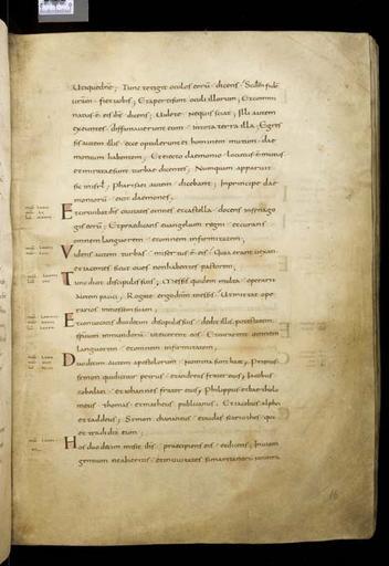 | Keywords: MCC-61050 Evangeliarium (Lebuïnuscodex) (34).jpg Artwork nl Anonymous Noordoost-Frankrijk Anonymous Rijnland Anonymous Maasland nl De kern van de boekband van de Lebuïnuscodex wordt gevormd door twee eikenhouten platten De rug en het achterplat zijn overtrokken met zeemleer Het voorplat is rijkelijk versierd met verguld zilversmeedwerk reliëfs van walrustand en verscheidene stenen De compositie van de bekleding van het voorplat wordt bepaald door een verguld zilveren filigraankruis Aan de uiteinden van de kruisarmen bevinden zich vierpassen met overhoeks vierkant eveneens met filigraan gedecoreerd Hiervan zijn er slechts twee bewaard gebleven en wel die aan de verticale kruisarmen Zij bevatten tevens nog de oorspronkelijke versiering bestaande uit een filigraanmedaillon met een pseudo-camee van respectievelijk een mannen- en een vrouwenhoofd in profiel Het snijpunt van het kruis wordt ingenomen door een ver vooruitstekend Bacchuskopje in chalcedoon te herkennen aan de kleine druiventrosjes in zijn haartooi Het kopje is gevat in een filigraanmedaillon welke op zijn beurt weer is geplaatst op een vierpas van filigraanwerk Op elk van de kruisarmen bevindt zich een ovale steen 'en cabochon' op een medaillon met filigraan Het filigraanwerk van kruis en sierstukken is in de vorm van visblazen In de ruimten tussen de kruisarmen zijn rechthoekige reliëfs van walrustand aangebracht met de vier evangelisten en hun symbool De reliëfs hebben de volgende afmetingen H 10 0 x B 5 5 cm Van links boven naar rechts onder betreft het Mattheus met de engel Johannes met de adelaar Marcus met de gevleugelde leeuw en Lucas met de gevleugelde os De figuren zijn paarsgewijs als elkaars spiegelbeeld ten opzichte van de middenas geplaatst Mattheus en Johannes zitten vrijwel geheel frontaal terwijl Marcus en Lucas meer in profiel zijn afgebeeld Qua opbouw verschillen de vier reliëfs nauwelijks van elkaar Binnen een rand van vierlobbige blaadjes verheffen zich twee zuilen met een basis een kapiteel en een dekplaat Hierop rust een rondboog geflankeerd door twee torens en afgedekt met een fronton dat boven Mattheus en Johannes boogvormig en boven Marcus en Lucas driehoekig is Onder deze overhuiving zitten de evangelisten gekleed in een lang gewaad en mantel met gekruiste benen aan een lessenaar hun blote voeten rustend op een bankje Allen zijn baardeloos en voorzien van een nimbus Voorts houden ze een pen in hun rechterhand terwijl hun linker op een boek ligt of gebarend is opgeheven Boven elk van de evangelisten verschijnt in de opening van het fronton zijn symbool met een spreukband Dit rijkelijk gedecoreerde middenveld wordt omlijst door sierbanden van verguld koper De opbouw van de sierlijsten is steeds dezelfde een opstaande smalle band die op regelmatige afstanden is voorzien van holten met aan weerszijden een brede strook voorzien van een gestanst motief Aan de lange zijden van de boekband bestaat het motief uit palmetten aan de korte zijden uit rozetten Van deze laatstgenoemde stroken ontbreekt steeds de buitenste rand Bij alle stroken met palmettenmotief wijzen de palmetten naar links met uitzondering van de buitenste strook rechtsboven die het motief in tegengestelde richting toont Verguld zilveren rozetten op de hoeken van het voorplat omgeven door een smalle rand van filigraanwerk met cirkelmotief en bekroond met een 'en cabochon' gezette steen completeren het geheel Van de rozet links onder ontbreekt de steen en is slechts de buitenste rand over Aan de voorzijde van de boekband bevinden zich nog de rudimenten van twee sluitingen between u'825' u'1000' u'1150' u'850' u'1199' u'1199' nl perkament eikenhout zilver goud koper walrustand chalcedoon glas leer Size 35 5 26 0 cm nl Hoogte 35 5cm Breedte 26 0cm Diepte 13 5cm Institution Museum Catharijneconvent object history exhibition history credit line nl Foto Museum Catharijneconvent Utrecht foto HetFotoAtelier Peter Rothengatter accession number Object number 61050 Inventory number ABM h1 place of creation https //www catharijneconvent nl/adlib/61050/ View this work on the website of Museum Catharijneconvent Museum Catharijneconvent Cc-zero <gallery> File MCC-61050_Evangeliarium_Lebuïnuscodex_ 11 jpg File MCC-61050_Evangeliarium_Lebuïnuscodex_ 172 jpg File MCC-61050_Evangeliarium_Lebuïnuscodex_ 212 jpg File MCC-61050_Evangeliarium_Lebuïnuscodex_ 61 jpg File MCC-61050_Evangeliarium_Lebuïnuscodex_ 12 jpg File MCC-61050_Evangeliarium_Lebuïnuscodex_ 213 jpg File MCC-61050_Evangeliarium_Lebuïnuscodex_ 56 jpg File MCC-61050_Evangeliarium_Lebuïnuscodex_ 232 jpg File MCC-61050_Evangeliarium_Lebuïnuscodex_ 93 jpg File MCC-61050_Evangeliarium_Lebuïnuscodex_ 99 jpg File MCC-61050_Evangeliarium_Lebuïnuscodex_ 184 jpg File MCC-61050_Evangeliarium_Lebuïnuscodex_ 64 jpg File MCC-61050_Evangeliarium_Lebuïnuscodex_ 299 jpg File MCC-61050_Evangeliarium_Lebuïnuscodex_ 86 jpg File MCC-61050_Evangeliarium_Lebuïnuscodex_ 260 jpg File MCC-61050_Evangeliarium_Lebuïnuscodex_ 159 jpg File MCC-61050_Evangeliarium_Lebuïnuscodex_ 247 jpg File MCC-61050_Evangeliarium_Lebuïnuscodex_ 180 jpg File MCC-61050_Evangeliarium_Lebuïnuscodex_ 121 jpg File MCC-61050_Evangeliarium_Lebuïnuscodex_ 315 jpg File MCC-61050_Evangeliarium_Lebuïnuscodex_ 284 jpg File MCC-61050_Evangeliarium_Lebuïnuscodex_ 33 jpg File MCC-61050_Evangeliarium_Lebuïnuscodex_ 44 jpg File MCC-61050_Evangeliarium_Lebuïnuscodex_ 258 jpg File MCC-61050_Evangeliarium_Lebuïnuscodex_ 237 jpg File MCC-61050_Evangeliarium_Lebuïnuscodex_ 20 jpg File MCC-61050_Evangeliarium_Lebuïnuscodex_ 220 jpg File MCC-61050_Evangeliarium_Lebuïnuscodex_ 279 jpg File MCC-61050_Evangeliarium_Lebuïnuscodex_ 183 jpg File MCC-61050_Evangeliarium_Lebuïnuscodex_ 60 jpg File MCC-61050_Evangeliarium_Lebuïnuscodex_ 166 jpg File MCC-61050_Evangeliarium_Lebuïnuscodex_ 97 jpg File MCC-61050_Evangeliarium_Lebuïnuscodex_ 71 jpg File MCC-61050_Evangeliarium_Lebuïnuscodex_ 132 jpg File MCC-61050_Evangeliarium_Lebuïnu