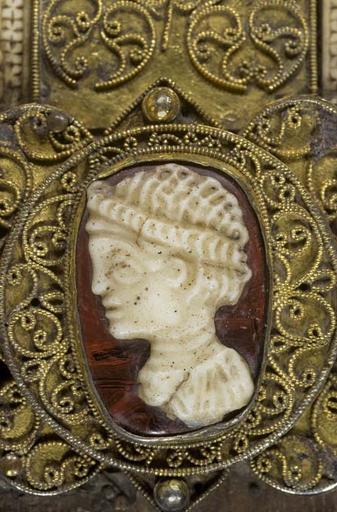 | Keywords: MCC-61050 Evangeliarium (Lebuïnuscodex) (328).jpg Artwork nl Anonymous Noordoost-Frankrijk Anonymous Rijnland Anonymous Maasland nl De kern van de boekband van de Lebuïnuscodex wordt gevormd door twee eikenhouten platten De rug en het achterplat zijn overtrokken met zeemleer Het voorplat is rijkelijk versierd met verguld zilversmeedwerk reliëfs van walrustand en verscheidene stenen De compositie van de bekleding van het voorplat wordt bepaald door een verguld zilveren filigraankruis Aan de uiteinden van de kruisarmen bevinden zich vierpassen met overhoeks vierkant eveneens met filigraan gedecoreerd Hiervan zijn er slechts twee bewaard gebleven en wel die aan de verticale kruisarmen Zij bevatten tevens nog de oorspronkelijke versiering bestaande uit een filigraanmedaillon met een pseudo-camee van respectievelijk een mannen- en een vrouwenhoofd in profiel Het snijpunt van het kruis wordt ingenomen door een ver vooruitstekend Bacchuskopje in chalcedoon te herkennen aan de kleine druiventrosjes in zijn haartooi Het kopje is gevat in een filigraanmedaillon welke op zijn beurt weer is geplaatst op een vierpas van filigraanwerk Op elk van de kruisarmen bevindt zich een ovale steen 'en cabochon' op een medaillon met filigraan Het filigraanwerk van kruis en sierstukken is in de vorm van visblazen In de ruimten tussen de kruisarmen zijn rechthoekige reliëfs van walrustand aangebracht met de vier evangelisten en hun symbool De reliëfs hebben de volgende afmetingen H 10 0 x B 5 5 cm Van links boven naar rechts onder betreft het Mattheus met de engel Johannes met de adelaar Marcus met de gevleugelde leeuw en Lucas met de gevleugelde os De figuren zijn paarsgewijs als elkaars spiegelbeeld ten opzichte van de middenas geplaatst Mattheus en Johannes zitten vrijwel geheel frontaal terwijl Marcus en Lucas meer in profiel zijn afgebeeld Qua opbouw verschillen de vier reliëfs nauwelijks van elkaar Binnen een rand van vierlobbige blaadjes verheffen zich twee zuilen met een basis een kapiteel en een dekplaat Hierop rust een rondboog geflankeerd door twee torens en afgedekt met een fronton dat boven Mattheus en Johannes boogvormig en boven Marcus en Lucas driehoekig is Onder deze overhuiving zitten de evangelisten gekleed in een lang gewaad en mantel met gekruiste benen aan een lessenaar hun blote voeten rustend op een bankje Allen zijn baardeloos en voorzien van een nimbus Voorts houden ze een pen in hun rechterhand terwijl hun linker op een boek ligt of gebarend is opgeheven Boven elk van de evangelisten verschijnt in de opening van het fronton zijn symbool met een spreukband Dit rijkelijk gedecoreerde middenveld wordt omlijst door sierbanden van verguld koper De opbouw van de sierlijsten is steeds dezelfde een opstaande smalle band die op regelmatige afstanden is voorzien van holten met aan weerszijden een brede strook voorzien van een gestanst motief Aan de lange zijden van de boekband bestaat het motief uit palmetten aan de korte zijden uit rozetten Van deze laatstgenoemde stroken ontbreekt steeds de buitenste rand Bij alle stroken met palmettenmotief wijzen de palmetten naar links met uitzondering van de buitenste strook rechtsboven die het motief in tegengestelde richting toont Verguld zilveren rozetten op de hoeken van het voorplat omgeven door een smalle rand van filigraanwerk met cirkelmotief en bekroond met een 'en cabochon' gezette steen completeren het geheel Van de rozet links onder ontbreekt de steen en is slechts de buitenste rand over Aan de voorzijde van de boekband bevinden zich nog de rudimenten van twee sluitingen between u'825' u'1000' u'1150' u'850' u'1199' u'1199' nl perkament eikenhout zilver goud koper walrustand chalcedoon glas leer Size 35 5 26 0 cm nl Hoogte 35 5cm Breedte 26 0cm Diepte 13 5cm Institution Museum Catharijneconvent object history exhibition history credit line nl Foto Museum Catharijneconvent Utrecht foto HetFotoAtelier Peter Rothengatter Reproduction title nl Boekband voorzijde detail met medaillon accession number Object number 61050 Inventory number ABM h1 place of creation https //www catharijneconvent nl/adlib/61050/ View this work on the website of Museum Catharijneconvent Museum Catharijneconvent Cc-zero <gallery> File MCC-61050_Evangeliarium_Lebuïnuscodex_ 11 jpg File MCC-61050_Evangeliarium_Lebuïnuscodex_ 172 jpg File MCC-61050_Evangeliarium_Lebuïnuscodex_ 212 jpg File MCC-61050_Evangeliarium_Lebuïnuscodex_ 61 jpg File MCC-61050_Evangeliarium_Lebuïnuscodex_ 12 jpg File MCC-61050_Evangeliarium_Lebuïnuscodex_ 213 jpg File MCC-61050_Evangeliarium_Lebuïnuscodex_ 56 jpg File MCC-61050_Evangeliarium_Lebuïnuscodex_ 232 jpg File MCC-61050_Evangeliarium_Lebuïnuscodex_ 93 jpg File MCC-61050_Evangeliarium_Lebuïnuscodex_ 99 jpg File MCC-61050_Evangeliarium_Lebuïnuscodex_ 184 jpg File MCC-61050_Evangeliarium_Lebuïnuscodex_ 64 jpg File MCC-61050_Evangeliarium_Lebuïnuscodex_ 299 jpg File MCC-61050_Evangeliarium_Lebuïnuscodex_ 86 jpg File MCC-61050_Evangeliarium_Lebuïnuscodex_ 260 jpg File MCC-61050_Evangeliarium_Lebuïnuscodex_ 159 jpg File MCC-61050_Evangeliarium_Lebuïnuscodex_ 247 jpg File MCC-61050_Evangeliarium_Lebuïnuscodex_ 180 jpg File MCC-61050_Evangeliarium_Lebuïnuscodex_ 121 jpg File MCC-61050_Evangeliarium_Lebuïnuscodex_ 315 jpg File MCC-61050_Evangeliarium_Lebuïnuscodex_ 284 jpg File MCC-61050_Evangeliarium_Lebuïnuscodex_ 33 jpg File MCC-61050_Evangeliarium_Lebuïnuscodex_ 44 jpg File MCC-61050_Evangeliarium_Lebuïnuscodex_ 258 jpg File MCC-61050_Evangeliarium_Lebuïnuscodex_ 237 jpg File MCC-61050_Evangeliarium_Lebuïnuscodex_ 20 jpg File MCC-61050_Evangeliarium_Lebuïnuscodex_ 220 jpg File MCC-61050_Evangeliarium_Lebuïnuscodex_ 279 jpg File MCC-61050_Evangeliarium_Lebuïnuscodex_ 183 jpg File MCC-61050_Evangeliarium_Lebuïnuscodex_ 60 jpg File MCC-61050_Evangeliarium_Lebuïnuscodex_ 166 jpg File MCC-61050_Evangeliarium_Lebuïnuscodex_ 97 jpg File MCC-61050_Evangeliarium_Lebuïnuscodex_ 71 jpg File MCC-61050_Evangeliariu