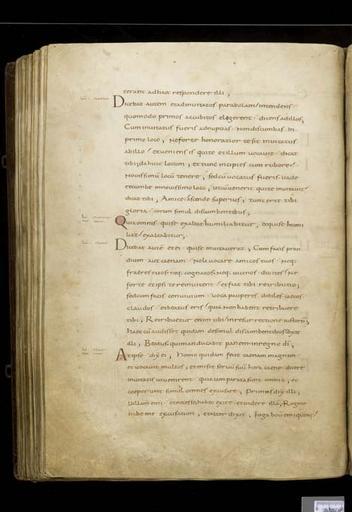 | Keywords: MCC-61050 Evangeliarium (Lebuïnuscodex) (191).jpg Artwork nl Anonymous Noordoost-Frankrijk Anonymous Rijnland Anonymous Maasland nl De kern van de boekband van de Lebuïnuscodex wordt gevormd door twee eikenhouten platten De rug en het achterplat zijn overtrokken met zeemleer Het voorplat is rijkelijk versierd met verguld zilversmeedwerk reliëfs van walrustand en verscheidene stenen De compositie van de bekleding van het voorplat wordt bepaald door een verguld zilveren filigraankruis Aan de uiteinden van de kruisarmen bevinden zich vierpassen met overhoeks vierkant eveneens met filigraan gedecoreerd Hiervan zijn er slechts twee bewaard gebleven en wel die aan de verticale kruisarmen Zij bevatten tevens nog de oorspronkelijke versiering bestaande uit een filigraanmedaillon met een pseudo-camee van respectievelijk een mannen- en een vrouwenhoofd in profiel Het snijpunt van het kruis wordt ingenomen door een ver vooruitstekend Bacchuskopje in chalcedoon te herkennen aan de kleine druiventrosjes in zijn haartooi Het kopje is gevat in een filigraanmedaillon welke op zijn beurt weer is geplaatst op een vierpas van filigraanwerk Op elk van de kruisarmen bevindt zich een ovale steen 'en cabochon' op een medaillon met filigraan Het filigraanwerk van kruis en sierstukken is in de vorm van visblazen In de ruimten tussen de kruisarmen zijn rechthoekige reliëfs van walrustand aangebracht met de vier evangelisten en hun symbool De reliëfs hebben de volgende afmetingen H 10 0 x B 5 5 cm Van links boven naar rechts onder betreft het Mattheus met de engel Johannes met de adelaar Marcus met de gevleugelde leeuw en Lucas met de gevleugelde os De figuren zijn paarsgewijs als elkaars spiegelbeeld ten opzichte van de middenas geplaatst Mattheus en Johannes zitten vrijwel geheel frontaal terwijl Marcus en Lucas meer in profiel zijn afgebeeld Qua opbouw verschillen de vier reliëfs nauwelijks van elkaar Binnen een rand van vierlobbige blaadjes verheffen zich twee zuilen met een basis een kapiteel en een dekplaat Hierop rust een rondboog geflankeerd door twee torens en afgedekt met een fronton dat boven Mattheus en Johannes boogvormig en boven Marcus en Lucas driehoekig is Onder deze overhuiving zitten de evangelisten gekleed in een lang gewaad en mantel met gekruiste benen aan een lessenaar hun blote voeten rustend op een bankje Allen zijn baardeloos en voorzien van een nimbus Voorts houden ze een pen in hun rechterhand terwijl hun linker op een boek ligt of gebarend is opgeheven Boven elk van de evangelisten verschijnt in de opening van het fronton zijn symbool met een spreukband Dit rijkelijk gedecoreerde middenveld wordt omlijst door sierbanden van verguld koper De opbouw van de sierlijsten is steeds dezelfde een opstaande smalle band die op regelmatige afstanden is voorzien van holten met aan weerszijden een brede strook voorzien van een gestanst motief Aan de lange zijden van de boekband bestaat het motief uit palmetten aan de korte zijden uit rozetten Van deze laatstgenoemde stroken ontbreekt steeds de buitenste rand Bij alle stroken met palmettenmotief wijzen de palmetten naar links met uitzondering van de buitenste strook rechtsboven die het motief in tegengestelde richting toont Verguld zilveren rozetten op de hoeken van het voorplat omgeven door een smalle rand van filigraanwerk met cirkelmotief en bekroond met een 'en cabochon' gezette steen completeren het geheel Van de rozet links onder ontbreekt de steen en is slechts de buitenste rand over Aan de voorzijde van de boekband bevinden zich nog de rudimenten van twee sluitingen between u'825' u'1000' u'1150' u'850' u'1199' u'1199' nl perkament eikenhout zilver goud koper walrustand chalcedoon glas leer Size 35 5 26 0 cm nl Hoogte 35 5cm Breedte 26 0cm Diepte 13 5cm Institution Museum Catharijneconvent object history exhibition history credit line nl Foto Museum Catharijneconvent Utrecht foto HetFotoAtelier Peter Rothengatter accession number Object number 61050 Inventory number ABM h1 place of creation https //www catharijneconvent nl/adlib/61050/ View this work on the website of Museum Catharijneconvent Museum Catharijneconvent Cc-zero <gallery> File MCC-61050_Evangeliarium_Lebuïnuscodex_ 11 jpg File MCC-61050_Evangeliarium_Lebuïnuscodex_ 172 jpg File MCC-61050_Evangeliarium_Lebuïnuscodex_ 212 jpg File MCC-61050_Evangeliarium_Lebuïnuscodex_ 61 jpg File MCC-61050_Evangeliarium_Lebuïnuscodex_ 12 jpg File MCC-61050_Evangeliarium_Lebuïnuscodex_ 213 jpg File MCC-61050_Evangeliarium_Lebuïnuscodex_ 56 jpg File MCC-61050_Evangeliarium_Lebuïnuscodex_ 232 jpg File MCC-61050_Evangeliarium_Lebuïnuscodex_ 93 jpg File MCC-61050_Evangeliarium_Lebuïnuscodex_ 99 jpg File MCC-61050_Evangeliarium_Lebuïnuscodex_ 184 jpg File MCC-61050_Evangeliarium_Lebuïnuscodex_ 64 jpg File MCC-61050_Evangeliarium_Lebuïnuscodex_ 299 jpg File MCC-61050_Evangeliarium_Lebuïnuscodex_ 86 jpg File MCC-61050_Evangeliarium_Lebuïnuscodex_ 260 jpg File MCC-61050_Evangeliarium_Lebuïnuscodex_ 159 jpg File MCC-61050_Evangeliarium_Lebuïnuscodex_ 247 jpg File MCC-61050_Evangeliarium_Lebuïnuscodex_ 180 jpg File MCC-61050_Evangeliarium_Lebuïnuscodex_ 121 jpg File MCC-61050_Evangeliarium_Lebuïnuscodex_ 315 jpg File MCC-61050_Evangeliarium_Lebuïnuscodex_ 284 jpg File MCC-61050_Evangeliarium_Lebuïnuscodex_ 33 jpg File MCC-61050_Evangeliarium_Lebuïnuscodex_ 44 jpg File MCC-61050_Evangeliarium_Lebuïnuscodex_ 258 jpg File MCC-61050_Evangeliarium_Lebuïnuscodex_ 237 jpg File MCC-61050_Evangeliarium_Lebuïnuscodex_ 20 jpg File MCC-61050_Evangeliarium_Lebuïnuscodex_ 220 jpg File MCC-61050_Evangeliarium_Lebuïnuscodex_ 279 jpg File MCC-61050_Evangeliarium_Lebuïnuscodex_ 183 jpg File MCC-61050_Evangeliarium_Lebuïnuscodex_ 60 jpg File MCC-61050_Evangeliarium_Lebuïnuscodex_ 166 jpg File MCC-61050_Evangeliarium_Lebuïnuscodex_ 97 jpg File MCC-61050_Evangeliarium_Lebuïnuscodex_ 71 jpg File MCC-61050_Evangeliarium_Lebuïnuscodex_ 132 jpg File MCC-61050_Evangeliarium_Lebuïn