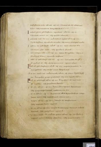 Keywords: MCC-61050 Evangeliarium (Lebuïnuscodex) (286).jpg Artwork nl Anonymous Noordoost-Frankrijk Anonymous Rijnland Anonymous Maasland nl De kern van de boekband van de Lebuïnuscodex wordt gevormd door twee eikenhouten platten De rug en het achterplat zijn overtrokken met zeemleer Het voorplat is rijkelijk versierd met verguld zilversmeedwerk reliëfs van walrustand en verscheidene stenen De compositie van de bekleding van het voorplat wordt bepaald door een verguld zilveren filigraankruis Aan de uiteinden van de kruisarmen bevinden zich vierpassen met overhoeks vierkant eveneens met filigraan gedecoreerd Hiervan zijn er slechts twee bewaard gebleven en wel die aan de verticale kruisarmen Zij bevatten tevens nog de oorspronkelijke versiering bestaande uit een filigraanmedaillon met een pseudo-camee van respectievelijk een mannen- en een vrouwenhoofd in profiel Het snijpunt van het kruis wordt ingenomen door een ver vooruitstekend Bacchuskopje in chalcedoon te herkennen aan de kleine druiventrosjes in zijn haartooi Het kopje is gevat in een filigraanmedaillon welke op zijn beurt weer is geplaatst op een vierpas van filigraanwerk Op elk van de kruisarmen bevindt zich een ovale steen 'en cabochon' op een medaillon met filigraan Het filigraanwerk van kruis en sierstukken is in de vorm van visblazen In de ruimten tussen de kruisarmen zijn rechthoekige reliëfs van walrustand aangebracht met de vier evangelisten en hun symbool De reliëfs hebben de volgende afmetingen H 10 0 x B 5 5 cm Van links boven naar rechts onder betreft het Mattheus met de engel Johannes met de adelaar Marcus met de gevleugelde leeuw en Lucas met de gevleugelde os De figuren zijn paarsgewijs als elkaars spiegelbeeld ten opzichte van de middenas geplaatst Mattheus en Johannes zitten vrijwel geheel frontaal terwijl Marcus en Lucas meer in profiel zijn afgebeeld Qua opbouw verschillen de vier reliëfs nauwelijks van elkaar Binnen een rand van vierlobbige blaadjes verheffen zich twee zuilen met een basis een kapiteel en een dekplaat Hierop rust een rondboog geflankeerd door twee torens en afgedekt met een fronton dat boven Mattheus en Johannes boogvormig en boven Marcus en Lucas driehoekig is Onder deze overhuiving zitten de evangelisten gekleed in een lang gewaad en mantel met gekruiste benen aan een lessenaar hun blote voeten rustend op een bankje Allen zijn baardeloos en voorzien van een nimbus Voorts houden ze een pen in hun rechterhand terwijl hun linker op een boek ligt of gebarend is opgeheven Boven elk van de evangelisten verschijnt in de opening van het fronton zijn symbool met een spreukband Dit rijkelijk gedecoreerde middenveld wordt omlijst door sierbanden van verguld koper De opbouw van de sierlijsten is steeds dezelfde een opstaande smalle band die op regelmatige afstanden is voorzien van holten met aan weerszijden een brede strook voorzien van een gestanst motief Aan de lange zijden van de boekband bestaat het motief uit palmetten aan de korte zijden uit rozetten Van deze laatstgenoemde stroken ontbreekt steeds de buitenste rand Bij alle stroken met palmettenmotief wijzen de palmetten naar links met uitzondering van de buitenste strook rechtsboven die het motief in tegengestelde richting toont Verguld zilveren rozetten op de hoeken van het voorplat omgeven door een smalle rand van filigraanwerk met cirkelmotief en bekroond met een 'en cabochon' gezette steen completeren het geheel Van de rozet links onder ontbreekt de steen en is slechts de buitenste rand over Aan de voorzijde van de boekband bevinden zich nog de rudimenten van twee sluitingen between u'825' u'1000' u'1150' u'850' u'1199' u'1199' nl perkament eikenhout zilver goud koper walrustand chalcedoon glas leer Size 35 5 26 0 cm nl Hoogte 35 5cm Breedte 26 0cm Diepte 13 5cm Institution Museum Catharijneconvent object history exhibition history credit line nl Foto Museum Catharijneconvent Utrecht foto HetFotoAtelier Peter Rothengatter accession number Object number 61050 Inventory number ABM h1 place of creation https //www catharijneconvent nl/adlib/61050/ View this work on the website of Museum Catharijneconvent Museum Catharijneconvent Cc-zero <gallery> File MCC-61050_Evangeliarium_Lebuïnuscodex_ 11 jpg File MCC-61050_Evangeliarium_Lebuïnuscodex_ 172 jpg File MCC-61050_Evangeliarium_Lebuïnuscodex_ 212 jpg File MCC-61050_Evangeliarium_Lebuïnuscodex_ 61 jpg File MCC-61050_Evangeliarium_Lebuïnuscodex_ 12 jpg File MCC-61050_Evangeliarium_Lebuïnuscodex_ 213 jpg File MCC-61050_Evangeliarium_Lebuïnuscodex_ 56 jpg File MCC-61050_Evangeliarium_Lebuïnuscodex_ 232 jpg File MCC-61050_Evangeliarium_Lebuïnuscodex_ 93 jpg File MCC-61050_Evangeliarium_Lebuïnuscodex_ 99 jpg File MCC-61050_Evangeliarium_Lebuïnuscodex_ 184 jpg File MCC-61050_Evangeliarium_Lebuïnuscodex_ 64 jpg File MCC-61050_Evangeliarium_Lebuïnuscodex_ 299 jpg File MCC-61050_Evangeliarium_Lebuïnuscodex_ 86 jpg File MCC-61050_Evangeliarium_Lebuïnuscodex_ 260 jpg File MCC-61050_Evangeliarium_Lebuïnuscodex_ 159 jpg File MCC-61050_Evangeliarium_Lebuïnuscodex_ 247 jpg File MCC-61050_Evangeliarium_Lebuïnuscodex_ 180 jpg File MCC-61050_Evangeliarium_Lebuïnuscodex_ 121 jpg File MCC-61050_Evangeliarium_Lebuïnuscodex_ 315 jpg File MCC-61050_Evangeliarium_Lebuïnuscodex_ 284 jpg File MCC-61050_Evangeliarium_Lebuïnuscodex_ 33 jpg File MCC-61050_Evangeliarium_Lebuïnuscodex_ 44 jpg File MCC-61050_Evangeliarium_Lebuïnuscodex_ 258 jpg File MCC-61050_Evangeliarium_Lebuïnuscodex_ 237 jpg File MCC-61050_Evangeliarium_Lebuïnuscodex_ 20 jpg File MCC-61050_Evangeliarium_Lebuïnuscodex_ 220 jpg File MCC-61050_Evangeliarium_Lebuïnuscodex_ 279 jpg File MCC-61050_Evangeliarium_Lebuïnuscodex_ 183 jpg File MCC-61050_Evangeliarium_Lebuïnuscodex_ 60 jpg File MCC-61050_Evangeliarium_Lebuïnuscodex_ 166 jpg File MCC-61050_Evangeliarium_Lebuïnuscodex_ 97 jpg File MCC-61050_Evangeliarium_Lebuïnuscodex_ 71 jpg File MCC-61050_Evangeliarium_Lebuïnuscodex_ 132 jpg File MCC-61050_Evangeliarium_Lebuïnus