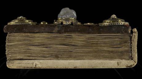 Keywords: MCC-61050 Evangeliarium (Lebuïnuscodex) (316).jpg Artwork nl Anonymous Noordoost-Frankrijk Anonymous Rijnland Anonymous Maasland nl De kern van de boekband van de Lebuïnuscodex wordt gevormd door twee eikenhouten platten De rug en het achterplat zijn overtrokken met zeemleer Het voorplat is rijkelijk versierd met verguld zilversmeedwerk reliëfs van walrustand en verscheidene stenen De compositie van de bekleding van het voorplat wordt bepaald door een verguld zilveren filigraankruis Aan de uiteinden van de kruisarmen bevinden zich vierpassen met overhoeks vierkant eveneens met filigraan gedecoreerd Hiervan zijn er slechts twee bewaard gebleven en wel die aan de verticale kruisarmen Zij bevatten tevens nog de oorspronkelijke versiering bestaande uit een filigraanmedaillon met een pseudo-camee van respectievelijk een mannen- en een vrouwenhoofd in profiel Het snijpunt van het kruis wordt ingenomen door een ver vooruitstekend Bacchuskopje in chalcedoon te herkennen aan de kleine druiventrosjes in zijn haartooi Het kopje is gevat in een filigraanmedaillon welke op zijn beurt weer is geplaatst op een vierpas van filigraanwerk Op elk van de kruisarmen bevindt zich een ovale steen 'en cabochon' op een medaillon met filigraan Het filigraanwerk van kruis en sierstukken is in de vorm van visblazen In de ruimten tussen de kruisarmen zijn rechthoekige reliëfs van walrustand aangebracht met de vier evangelisten en hun symbool De reliëfs hebben de volgende afmetingen H 10 0 x B 5 5 cm Van links boven naar rechts onder betreft het Mattheus met de engel Johannes met de adelaar Marcus met de gevleugelde leeuw en Lucas met de gevleugelde os De figuren zijn paarsgewijs als elkaars spiegelbeeld ten opzichte van de middenas geplaatst Mattheus en Johannes zitten vrijwel geheel frontaal terwijl Marcus en Lucas meer in profiel zijn afgebeeld Qua opbouw verschillen de vier reliëfs nauwelijks van elkaar Binnen een rand van vierlobbige blaadjes verheffen zich twee zuilen met een basis een kapiteel en een dekplaat Hierop rust een rondboog geflankeerd door twee torens en afgedekt met een fronton dat boven Mattheus en Johannes boogvormig en boven Marcus en Lucas driehoekig is Onder deze overhuiving zitten de evangelisten gekleed in een lang gewaad en mantel met gekruiste benen aan een lessenaar hun blote voeten rustend op een bankje Allen zijn baardeloos en voorzien van een nimbus Voorts houden ze een pen in hun rechterhand terwijl hun linker op een boek ligt of gebarend is opgeheven Boven elk van de evangelisten verschijnt in de opening van het fronton zijn symbool met een spreukband Dit rijkelijk gedecoreerde middenveld wordt omlijst door sierbanden van verguld koper De opbouw van de sierlijsten is steeds dezelfde een opstaande smalle band die op regelmatige afstanden is voorzien van holten met aan weerszijden een brede strook voorzien van een gestanst motief Aan de lange zijden van de boekband bestaat het motief uit palmetten aan de korte zijden uit rozetten Van deze laatstgenoemde stroken ontbreekt steeds de buitenste rand Bij alle stroken met palmettenmotief wijzen de palmetten naar links met uitzondering van de buitenste strook rechtsboven die het motief in tegengestelde richting toont Verguld zilveren rozetten op de hoeken van het voorplat omgeven door een smalle rand van filigraanwerk met cirkelmotief en bekroond met een 'en cabochon' gezette steen completeren het geheel Van de rozet links onder ontbreekt de steen en is slechts de buitenste rand over Aan de voorzijde van de boekband bevinden zich nog de rudimenten van twee sluitingen between u'825' u'1000' u'1150' u'850' u'1199' u'1199' nl perkament eikenhout zilver goud koper walrustand chalcedoon glas leer Size 35 5 26 0 cm nl Hoogte 35 5cm Breedte 26 0cm Diepte 13 5cm Institution Museum Catharijneconvent object history exhibition history credit line nl Foto Museum Catharijneconvent Utrecht foto HetFotoAtelier Peter Rothengatter Reproduction title nl Boekband bovenzijde accession number Object number 61050 Inventory number ABM h1 place of creation https //www catharijneconvent nl/adlib/61050/ View this work on the website of Museum Catharijneconvent Museum Catharijneconvent Cc-zero <gallery> File MCC-61050_Evangeliarium_Lebuïnuscodex_ 11 jpg File MCC-61050_Evangeliarium_Lebuïnuscodex_ 172 jpg File MCC-61050_Evangeliarium_Lebuïnuscodex_ 212 jpg File MCC-61050_Evangeliarium_Lebuïnuscodex_ 61 jpg File MCC-61050_Evangeliarium_Lebuïnuscodex_ 12 jpg File MCC-61050_Evangeliarium_Lebuïnuscodex_ 213 jpg File MCC-61050_Evangeliarium_Lebuïnuscodex_ 56 jpg File MCC-61050_Evangeliarium_Lebuïnuscodex_ 232 jpg File MCC-61050_Evangeliarium_Lebuïnuscodex_ 93 jpg File MCC-61050_Evangeliarium_Lebuïnuscodex_ 99 jpg File MCC-61050_Evangeliarium_Lebuïnuscodex_ 184 jpg File MCC-61050_Evangeliarium_Lebuïnuscodex_ 64 jpg File MCC-61050_Evangeliarium_Lebuïnuscodex_ 299 jpg File MCC-61050_Evangeliarium_Lebuïnuscodex_ 86 jpg File MCC-61050_Evangeliarium_Lebuïnuscodex_ 260 jpg File MCC-61050_Evangeliarium_Lebuïnuscodex_ 159 jpg File MCC-61050_Evangeliarium_Lebuïnuscodex_ 247 jpg File MCC-61050_Evangeliarium_Lebuïnuscodex_ 180 jpg File MCC-61050_Evangeliarium_Lebuïnuscodex_ 121 jpg File MCC-61050_Evangeliarium_Lebuïnuscodex_ 315 jpg File MCC-61050_Evangeliarium_Lebuïnuscodex_ 284 jpg File MCC-61050_Evangeliarium_Lebuïnuscodex_ 33 jpg File MCC-61050_Evangeliarium_Lebuïnuscodex_ 44 jpg File MCC-61050_Evangeliarium_Lebuïnuscodex_ 258 jpg File MCC-61050_Evangeliarium_Lebuïnuscodex_ 237 jpg File MCC-61050_Evangeliarium_Lebuïnuscodex_ 20 jpg File MCC-61050_Evangeliarium_Lebuïnuscodex_ 220 jpg File MCC-61050_Evangeliarium_Lebuïnuscodex_ 279 jpg File MCC-61050_Evangeliarium_Lebuïnuscodex_ 183 jpg File MCC-61050_Evangeliarium_Lebuïnuscodex_ 60 jpg File MCC-61050_Evangeliarium_Lebuïnuscodex_ 166 jpg File MCC-61050_Evangeliarium_Lebuïnuscodex_ 97 jpg File MCC-61050_Evangeliarium_Lebuïnuscodex_ 71 jpg File MCC-61050_Evangeliarium_Lebuïnuscodex_ 132 