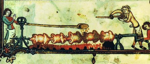 | Keywords: Meat on spit.jpg Chickens being roasted on a spit Romance of Alexander Bruges 1338-44 The Bodleian Library Oxford MS 264 fol 170v Scanned from Maggie Black's Den medeltida kokboken Swedish translation of The Medieval Cookbook ISBN 91-7712-380-8 PD-old Roast poultry Chickens in art Rotisserie Chicken cooking Bodleian Library MS Bodley 264 170v |