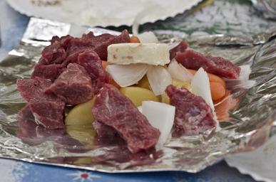 Keywords: meat raw outdoor cooking onion butter carrots stew steak barbeque meal lunch dinner uncooked