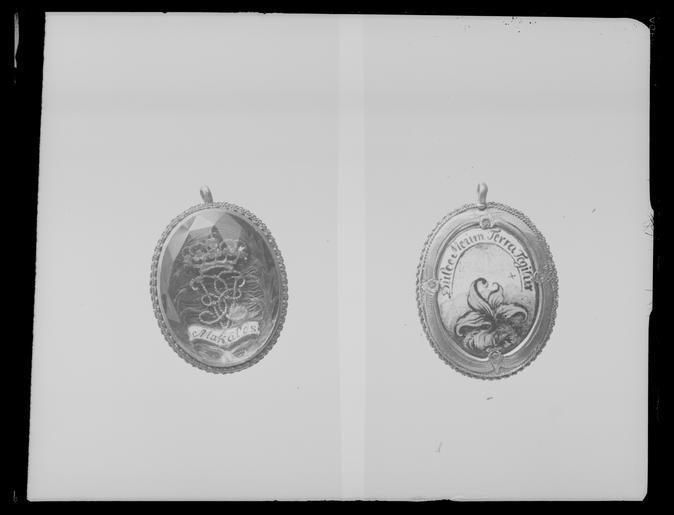| Keywords: Medaljong - Livrustkammaren - 36554.tif LSH artwork sv Oval medaljong täckt på framsidan av fasettslipat glas i slät fattning därunder matt av cendréfärgat hår över vilket är fäst krönt spegelmonogram av guld V E omgivet av grönemaljerad palmbladskrans nertill vitemaljerat textband med svart text Makalös <br/>Baksidan täckt med polykrom emaljmålning fyrbladig grön växt rosabrunt moln upptill vitt band med svart text Dulce Meum Terra Tegitur nedanför bandet syns delvis en strålande sol Svagt fyrpassformig ram av guld med graverade detaljer längs kanten en dubbel repstav av guld Vid överkanten en ring av guld <br/> Tidigare trodde man att medaljongen var ifrån 1720-talet men senare efterforskningar tyder på att denna sannolikt är tillverkad 1741 i samband med Ulrika Eleonora d y död Texten Dulce meum terra tegitur Jorden täcker min söta kan härledas till Mary Queen of Scots 1542-1587 Hon myntade devisen då hennes första make Francis II av Frankrike 1544-1560 dog Hon kopplade också devisen till lakritsplantan där bladen ovan jord är bittra men plantans rot som göms i jorden är söt Möjligen är det en lakritsplanta som syns på frånsidan av Ulrika Eleonoras medaljong <br/>lefi 2015-08-12 original caption 1741-tal gold - glass - enamel Färg polykrom material emalj - glass g 11 size mm 22 30 8 LRK Ulrika Eleonora av Sverige Spelet om Skåne 1993 Drottning i fiendeland 1995 Det Glittrar prel till 30 aug 2015 2014-2015 Livrustkammaren place of origin original filename LN_E01860 37632 inventory number LRK 1057 36554 CC0 Medaljong - Livrustkammaren - 36554-negative tif <gallery caption Different images of same object > File Baksida av medaljong med texten Dulce Meum Terra Tegitur - Livrustkammaren - 97853 tif File Medaljong med cendréfärgat hår över vilket är fäst krönt spegelmonogram av guld U E - Livrustkammaren - 97852 tif </gallery> Jewellery Media contributed by LSH malformated year Media contributed by LSH 2015-11 |