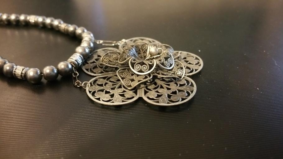 Keywords: medallion necklace metal flower jewelry design pewter warm glow style