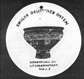 | Keywords: Medallion Urnenfund bei Litzmannstadt.png en Ceramic medallion issued by the the Gausammlungen of the Winterhilfswerk WHW Depicts a funerary urn of the Przeworsk culture ca 2nd century AD found at Biala near Lódz the urn itself is incised with a swastika symbol Inscribed with EWIGER DEUTSCHER OSTEN / Urnenfund bei Litzmannstadt / 100 n Z This is nr 22 of a series of such medallions issued by the WHW entitled Ewiger Deutscher Osten Eternal German East in the collection drive of winter 1942/43 Reproduced in Andrej Mikolajczyk 'Didactic presentations of the past some retrospective considerations in relation to the Archaeological and Ethnographical Museum Lódz Poland' in Gathercole and Lowenthal eds The Politics of the Past 1990 fig 19 5 p 250 caption Ceramic medallion issued by the Nazi authorities showing urn with swastika The entire series of Gau 36 Wartheland issued in winters 1941/42 and 1942/43 consisted of Neue Heimat Wartheland 1941/42 007 Am Ziel 008 Aus Bessarabien 010 Aus Galizien 011 Aus Wolhynien 012 Bei 30 Grad Kälte 013 Der große Treck 014 30 Tage Marsch Ewiger deutscher Osten 1942/43 015 Der große Kurfürst 016 Deutscher Ritterordenhttp //odkrywca pl/forum_pics/picsforum22/dsc00412_copy2 jpg 017 Die Hanse 018 Die Wikinger 019 Friedrich der Große 020 General Litzmann 021 Heinrich der Löwe 022 Urnenfund bei Litzmannstadt 023 Wartheland - Kernland des deutschen Ostens 024 Wir sind fest entschlossen Literature Reinhard Tieste Spendenbelege des WHW Band V Gausammlungen 1933-1945 Gaue 31-40 1993 http //www tieste de/oldhomepage/whw/gaue3140/gau_36 htm Niemieckiej Pomocy Zimowej org Winterhilfswerk des Deutschen Volkes WHW Na medalionie wizerunek ozdobionej symbolem swastyki popielnicy z okresu tzw kultury przeworskiej III w p n e - V w n e znalezionej w Białej pod Łodzią Całość sygnowana tekstem Odwieczny Niemiecki Wschód / Wykopalisko spod Litzmannstadt / 100 n e org EWIGER DEUTSCHER OSTEN / Urnenfund bei Litzmannstadt / 100 n Z Pozycja 22 tej kolekcji wydanej w okresie 1942/43 i zatytuowanej Odwieczny Niemiecki Wschód Reprodukcja z prezentacji Andrzeja Mikołajczyka Didactic presentations of the past some retrospective considerations in relation to the Archaeological and Ethnographical Museum Lódz Poland na konferencji w 1990 Conference Proceedings edition The Politics of the past / edited by Peter Gathercole David Lowenthal ryc 19 5 str 250 podpis Ceramiczny medalion przedstawiający urnę ze swastyką wydany przez władze Nazistowskie Literatura Reinhard Tieste Spendenbelege des WHW Band V Gausammlungen 1933-1945 Gaue 31-40 1993 http //www tieste de/oldhomepage/whw/gaue3140/gau_36 htm Nazi propaganda medallion issued 1942/43 Winterhilfswerk artist unknown 1942/43 anonymous-EU PD-GermanGov Nazi symbol Hands of God Nazi propaganda Medallions |