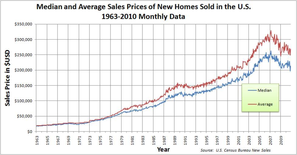 | Keywords: Median and Average Sales Prices of New Homes Sold in the US 1963-2010 Monthly.png graph en Chart showing the median and average sales prices read USD as USD or US ignore symbols in vertical axis labels of new homes sold in the United States by month/year Based on http //www census gov/ftp/pub/const/usprice_cust xls US Census Median and Average Sales Price of New Houses Sold Data Please note that the sales price includes land Also the average from 1963 to 1974 inclusively is annual and not monthly own Smallman12q 2010-01-22 sortable wikitable center style background f0f0f0; Period center style background f0f0f0; Median center style background f0f0f0; Average - Jan 1963 17 200 19 300 - Feb 1963 17 700 19 300 - Mar 1963 18 200 19 300 - Apr 1963 18 200 19 300 - May 1963 17 500 19 300 - Jun 1963 18 000 19 300 - Jul 1963 18 400 19 300 - Aug 1963 17 800 19 300 - Sep 1963 17 900 19 300 - Oct 1963 17 600 19 300 - Nov 1963 18 400 19 300 - Dec 1963 18 700 19 300 - Jan 1964 17 800 20 500 - Feb 1964 18 000 20 500 - Mar 1964 19 000 20 500 - Apr 1964 18 800 20 500 - May 1964 19 300 20 500 - Jun 1964 18 800 20 500 - Jul 1964 19 100 20 500 - Aug 1964 18 900 20 500 - Sep 1964 18 900 20 500 - Oct 1964 18 900 20 500 - Nov 1964 19 300 20 500 - Dec 1964 21 000 20 500 - Jan 1965 20 700 21 500 - Feb 1965 20 400 21 500 - Mar 1965 19 800 21 500 - Apr 1965 19 900 21 500 - May 1965 19 600 21 500 - Jun 1965 19 800 21 500 - Jul 1965 21 000 21 500 - Aug 1965 20 200 21 500 - Sep 1965 19 600 21 500 - Oct 1965 19 900 21 500 - Nov 1965 20 600 21 500 - Dec 1965 20 300 21 500 - Jan 1966 21 200 23 300 - Feb 1966 20 900 23 300 - Mar 1966 20 800 23 300 - Apr 1966 23 000 23 300 - May 1966 22 300 23 300 - Jun 1966 21 200 23 300 - Jul 1966 21 800 23 300 - Aug 1966 20 700 23 300 - Sep 1966 22 200 23 300 - Oct 1966 20 800 23 300 - Nov 1966 21 700 23 300 - Dec 1966 21 700 23 300 - Jan 1967 22 200 24 600 - Feb 1967 22 400 24 600 - Mar 1967 22 400 24 600 - Apr 1967 22 300 24 600 - May 1967 23 700 24 600 - Jun 1967 23 900 24 600 - Jul 1967 23 300 24 600 - Aug 1967 21 700 24 600 - Sep 1967 22 800 24 600 - Oct 1967 22 300 24 600 - Nov 1967 23 100 24 600 - Dec 1967 22 200 24 600 - Jan 1968 23 400 26 600 - Feb 1968 23 500 26 600 - Mar 1968 24 600 26 600 - Apr 1968 24 500 26 600 - May 1968 25 300 26 600 - Jun 1968 25 400 26 600 - Jul 1968 24 600 26 600 - Aug 1968 25 000 26 600 - Sep 1968 25 000 26 600 - Oct 1968 25 600 26 600 - Nov 1968 24 600 26 600 - Dec 1968 26 500 26 600 - Jan 1969 24 600 27 900 - Feb 1969 26 000 27 900 - Mar 1969 26 200 27 900 - Apr 1969 25 900 27 900 - May 1969 26 900 27 900 - Jun 1969 25 200 27 900 - Jul 1969 26 800 27 900 - Aug 1969 24 900 27 900 - Sep 1969 26 000 27 900 - Oct 1969 24 400 27 900 - Nov 1969 24 900 27 900 - Dec 1969 25 100 27 900 - Jan 1970 23 600 26 600 - Feb 1970 24 100 26 600 - Mar 1970 24 100 26 600 - Apr 1970 24 200 26 600 - May 1970 25 700 26 600 - Jun 1970 23 800 26 600 - Jul 1970 22 900 26 600 - Aug 1970 23 500 26 600 - Sep 1970 22 600 26 600 - Oct 1970 22 100 26 600 - Nov 1970 23 500 26 600 - Dec 1970 22 300 26 600 - Jan 1971 23 900 28 300 - Feb 1971 24 500 28 300 - Mar 1971 24 300 28 300 - Apr 1971 25 800 28 300 - May 1971 25 500 28 300 - Jun 1971 26 100 28 300 - Jul 1971 25 200 28 300 - Aug 1971 25 300 28 300 - Sep 1971 25 400 28 300 - Oct 1971 25 600 28 300 - Nov 1971 25 700 28 300 - Dec 1971 25 300 28 300 - Jan 1972 24 700 30 500 - Feb 1972 26 500 30 500 - Mar 1972 27 400 30 500 - Apr 1972 26 700 30 500 - May 1972 27 000 30 500 - Jun 1972 26 800 30 500 - Jul 1972 27 700 30 500 - Aug 1972 28 100 30 500 - Sep 1972 28 000 30 500 - Oct 1972 28 900 30 500 - Nov 1972 29 100 30 500 - Dec 1972 29 700 30 500 - Jan 1973 29 900 35 500 - Feb 1973 29 700 35 500 - Mar 1973 31 400 35 500 - Apr 1973 32 800 35 500 - May 1973 32 000 35 500 - Jun 1973 33 100 35 500 - Jul 1973 34 200 35 500 - Aug 1973 33 200 35 500 - Sep 1973 33 200 35 500 - Oct 1973 33 300 35 500 - Nov 1973 34 000 35 500 - Dec 1973 35 700 35 500 - Jan 1974 34 200 38 900 - Feb 1974 34 900 38 900 - Mar 1974 36 000 38 900 - Apr 1974 35 700 38 900 - May 1974 35 700 38 900 - Jun 1974 35 100 38 900 - Jul 1974 36 800 38 900 - Aug 1974 35 700 38 900 - Sep 1974 36 200 38 900 - Oct 1974 37 200 38 900 - Nov 1974 37 300 38 900 - Dec 1974 37 400 38 900 - Jan 1975 37 200 39 500 - Feb 1975 37 900 40 600 - Mar 1975 38 800 42 100 - Apr 1975 39 200 42 000 - May 1975 39 500 43 200 - Jun 1975 37 900 42 500 - Jul 1975 38 600 42 300 - Aug 1975 38 200 41 200 - Sep 1975 39 700 43 400 - Oct 1975 40 700 43 900 - Nov 1975 41 100 43 700 - Dec 1975 42 100 45 900 - Jan 1976 41 600 45 300 - Feb 1976 42 700 45 900 - Mar 1976 43 600 46 800 - Apr 1976 43 300 46 800 - May 1976 43 600 47 500 - Jun 1976 46 100 49 200 - Jul 1976 44 600 48 000 - Aug 1976 44 200 48 500 - Sep 1976 44 700 48 200 - Oct 1976 45 300 50 400 - Nov 1976 45 800 50 000 - Dec 1976 45 900 50 600 - Jan 1977 45 500 50 700 - Feb 1977 47 400 52 600 - Mar 1977 46 200 51 600 - Apr 1977 48 700 54 600 - May 1977 49 300 54 400 - Jun 1977 48 700 53 900 - Jul 1977 48 600 53 600 - Aug 1977 49 000 54 300 - Sep 1977 48 500 53 900 - Oct 1977 51 400 57 200 - Nov 1977 51 800 57 800 - Dec 1977 52 700 57 600 - Jan 1978 52 300 58 500 - Feb 1978 53 200 59 100 - Mar 1978 53 200 59 900 - Apr 1978 53 300 59 300 - May 1978 55 700 62 300 - Jun 1978 56 700 63 200 - Jul 1978 54 800 62 900 - Aug 1978 56 100 63 000 - Sep 1978 57 300 64 400 - Oct 1978 58 300 65 700 - Nov 1978 58 700 66 300 - Dec 1978 59 900 67 400 - Jan 1979 60 300 67 700 - Feb 1979 61 200 68 700 - Mar 1979 60 400 68 500 - Apr 1979 62 600 71 000 - May 1979 62 800 71 800 - Jun 1979 64 200 74 300 - Jul 1979 63 800 71 900 - Aug 1979 64 000 74 000 - Sep 1979 66 000 76 800 - Oct 1979 62 300 71 500 - Nov 1979 63 900 74 200 - Dec 1979 61 500 72 600 - Jan 1980 62 900 72 400 - Feb 1980 64 900 76 600 - Mar 1980 62 600 71 600 - Apr 1980 63 100 74 600 - May 1980 63 100 72 800 - Jun 1980 64 900 75 600 - Jul 1980 64 000 76 700 - Aug 1980 63 400 76 000 - Sep 1980 68 300 80 1