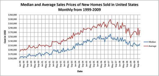 | Keywords: Median and Average Sales Prices of New Homes Sold in United States Monthly from 1999-2009.png en A graph showing the Median and Average Sales Prices of New Homes Sold in United States It shows the monthly data from 1999 through 2009 It should be noted that the sales price includes the land This graph is made using the data from The graph was made in excel I Smallman12q talk created this graph based on the tables provided by the US Census Bureau at http //www census gov/const/uspricemon pdf http //www mediafire com/ 7si89zm84plx3 Graph file 13 32 5 January 2010 UTC Smallman12q talk File Median_and_Average_Sales_Prices_of_New_Homes_Sold_in_United_States_Monthly_from_1999-2009 pdf The data is as follows center style background f0f0f0; Date center style background f0f0f0; Median center style background f0f0f0; Average - Jan-99 153 100 182 900 - Feb-99 160 000 191 400 - Mar-99 157 300 189 300 - Apr-99 159 900 192 200 - May-99 154 400 187 900 - Jun-99 159 300 193 900 - Jul-99 158 200 189 100 - Aug-99 154 800 193 100 - Sep-99 163 200 194 800 - Oct-99 161 100 200 200 - Nov-99 172 000 211 500 - Dec-99 164 800 202 100 - Jan-00 163 500 200 300 - Feb-00 162 400 199 200 - Mar-00 165 100 204 900 - Apr-00 162 600 207 300 - May-00 164 700 200 000 - Jun-00 160 100 197 700 - Jul-00 169 000 202 200 - Aug-00 166 600 200 200 - Sep-00 171 500 208 300 - Oct-00 176 300 215 100 - Nov-00 174 700 210 700 - Dec-00 162 000 208 100 - Jan-01 171 300 209 000 - Feb-01 169 100 211 000 - Mar-01 166 300 210 200 - Apr-01 175 200 205 500 - May-01 175 300 211 400 - Jun-01 179 400 211 700 - Jul-01 175 000 209 300 - Aug-01 173 700 207 500 - Sep-01 166 400 203 300 - Oct-01 171 300 207 100 - Nov-01 168 100 206 900 - Dec-01 180 200 228 700 - Jan-02 187 100 226 900 - Feb-02 191 100 226 500 - Mar-02 183 400 227 100 - Apr-02 187 100 228 100 - May-02 181 000 226 500 - Jun-02 190 600 225 200 - Jul-02 175 600 217 800 - Aug-02 178 900 221 300 - Sep-02 177 500 215 300 - Oct-02 189 200 231 300 - Nov-02 181 200 227 100 - Dec-02 197 600 237 800 - Jan-03 181 700 230 200 - Feb-03 187 000 233 400 - Mar-03 185 100 231 100 - Apr-03 189 500 237 200 - May-03 195 500 243 700 - Jun-03 187 900 239 700 - Jul-03 190 200 248 400 - Aug-03 190 500 241 000 - Sep-03 192 000 254 500 - Oct-03 194 100 242 800 - Nov-03 207 100 268 300 - Dec-03 196 000 253 900 - Jan-04 209 500 262 100 - Feb-04 219 600 264 100 - Mar-04 209 600 261 000 - Apr-04 222 300 269 300 - May-04 211 700 260 400 - Jun-04 215 700 263 200 - Jul-04 212 400 279 200 - Aug-04 218 100 272 200 - Sep-04 211 600 269 200 - Oct-04 229 200 289 600 - Nov-04 224 500 283 200 - Dec-04 229 600 284 300 - Jan-05 223 100 283 000 - Feb-05 237 300 289 100 - Mar-05 229 300 289 600 - Apr-05 236 300 289 100 - May-05 228 300 287 400 - Jun-05 226 100 279 600 - Jul-05 229 200 289 300 - Aug-05 240 100 295 000 - Sep-05 240 400 299 600 - Oct-05 243 900 293 600 - Nov-05 237 900 294 400 - Dec-05 238 600 290 200 - Jan-06 244 900 301 000 - Feb-06 250 800 307 900 - Mar-06 238 800 298 800 - Apr-06 257 000 310 300 - May-06 238 200 293 900 - Jun-06 243 200 305 000 - Jul-06 238 100 311 300 - Aug-06 243 900 317 300 - Sep-06 226 700 296 200 - Oct-06 250 400 306 800 - Nov-06 240 100 291 800 - Dec-06 244 700 301 900 - Jan-07 254 400 314 600 - Feb-07 250 800 321 500 - Mar-07 262 600 329 400 - Apr-07 242 500 311 700 - May-07 245 000 309 700 - Jun-07 235 500 306 500 - Jul-07 246 200 307 100 - Aug-07 236 500 301 300 - Sep-07 240 300 292 200 - Oct-07 234 300 310 100 - Nov-07 249 100 316 800 - Dec-07 227 700 284 400 - Jan-08 232 400 284 600 - Feb-08 245 300 301 200 - Mar-08 229 300 287 600 - Apr-08 246 400 314 300 - May-08 229 300 298 200 - Jun-08 234 300 299 400 - Jul-08 237 300 301 900 - Aug-08 221 000 265 500 - Sep-08 225 200 287 100 - Oct-08 213 200 274 000 - Nov-08 221 600 290 100 - Dec-08 229 600 263 100 - Jan-09 208 600 245 200 - Feb-09 209 700 258 600 - Mar-09 205 100 259 800 - Apr-09 219 200 269 800 - May-09 222 300 274 600 - Jun-09 214 700 274 800 - Jul-09 214 200 271 100 - Aug-09 207 100 257 800 - Sep-09 213 500 289 200 - Oct-09 209 400 255 900 - Nov-09 217 400 280 300 - Smallman12q en Original upload log en wikipedia FtCG page en wikipedia Median_and_Average_Sales_Prices_of_New_Homes_Sold_in_United_States_Monthly_from_1999-2009 png wikitable Date/Time Dimensions User Comment - 14 50 12 October 2011 2 136 × 1 022 22 953 bytes Smallman12q w en <nowiki> Wrong chart </nowiki> - 14 45 12 October 2011 1 066 × 557 54 228 bytes Smallman12q w en <nowiki> Updated </nowiki> - 13 48 5 January 2010 2 136 × 1 022 22 953 bytes Smallman12q w en <nowiki> A graph showing the Median and Average Sales Prices of New Homes Sold in United States It shows the monthly data from 1999 through 2009 It should be noted that the sales price includes the land This graph is made usin </nowiki> Diagrams in English Housing in the United States |