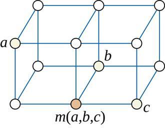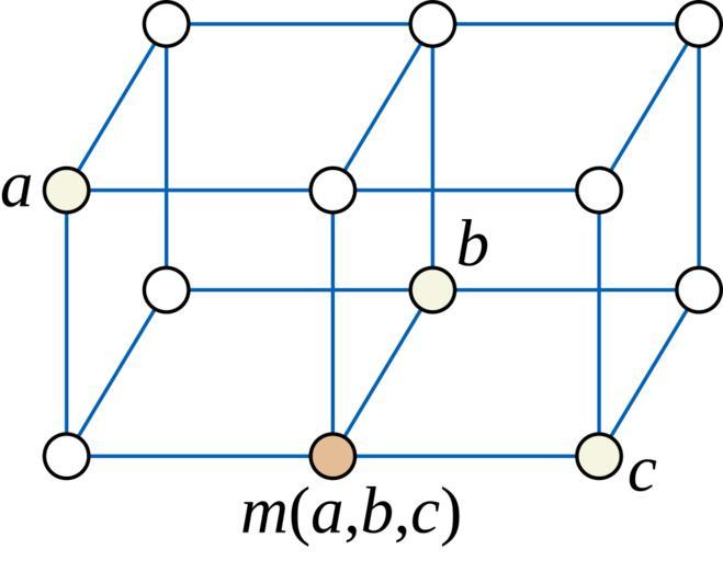 Keywords: Median graph.svg The median of three vertices in a median graph Own 2008-04-16 David Eppstein Files by User David Eppstein from en wikipedia Related to the cube Graphs with 12 vertices