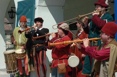 Keywords: medieval band singing instruments drums trumpet costumes funny red