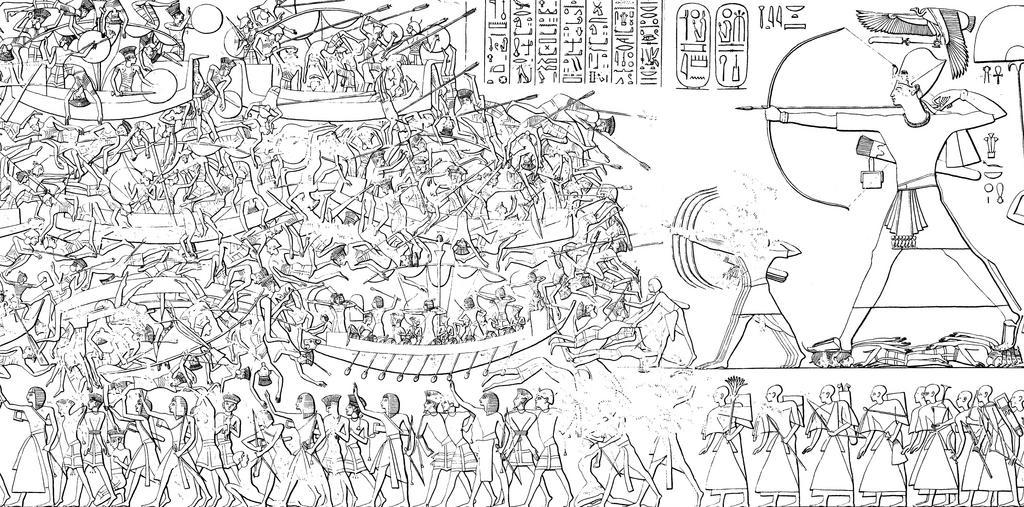 Keywords: Medinet Habu Ramses III. Tempel Nordostwand Abzeichnung 01.jpg de Umzeichnung des Seevölkerkrieges an der Nordostwand des Totentempels Ramses ™ III in Medinet Habu Ă„gypten Dorothea Gray Seewesen Archaeologia Homerica Band I Kapitel G Göttingen 1974 S 166/167 1200 “1150 B C author PD-old-100 Seevölker jpg Navy of Egypt Ramses III Sea Peoples Northeast wall of Medinet Habu Temple Reliefs in Medinet Habu Temple - details Ancient Egyptian Navy Naval battle of Delta |