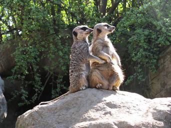 Keywords: meerkat cute mammal wildlife brown standing watchful funny looking rock hug suricata suricate suricatta friends companions love