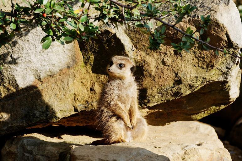 Keywords: meerkat rock sitting evening sun enclosure animal zoo