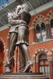 Keywords: meeting place statue man woman pair love kiss hugging st pancras station london
