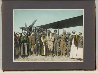| Keywords: Meetings of British, Arab, and Bedouin officials in Amman, Jordan, April 1921 - File 14.tif en Photographs show meetings between Arab Bedouin and British officials around April 17-27 1921 at Amir Abdullah ibn Hussein's camp at Amman Jordan During these meetings British High Commissioner Herbert Samuel proclaimed Amir Abdullah as the ruler of Transjordan under British protection Among the persons depicted are Amir Abdullah John D Whiting possibly Sheik Sultan of the Belka Sultan ibn 'Ali id Diab ul 'Adwan Amir Shaker bin Zeid future Regent of Transjordan Bedouin chief Auda Abu Tayi Sheik Majid Pasha el Adwan Herbert Samuel British civil administrator Wyndham Deedes British diplomat Albert Abramson T E Lawrence Lawrence of Arabia and possibly Iraq civil administrator Gertrude Bell Also shown are horse racing an airplane landing at Abdullah's camp Circassian leaders Abudullah's bodyguard on camels and Herbert Samuel reading his proclamation of Abdullah as leader of Transjordan Reproduction Number LC-DIG-ppmsca-15304 digital files of original photos LC-DIG-ppmsca-15305 digital files of album pages Rights Advisory No known restrictions on publication Access Advisory For reference access please use the digital images in the online catalog to preserve the fragile original items Notes Photographs were created by the photographers of the American Colony Photo Department located in Jerusalem Founded in the late 1890s by Elijah Meyers the photo agency was headed during its heyday ca 1903-1933 by Lewis Larsson whose staff photographers included Erik Lind Lars Lind Furman Baldwin and G Eric Matson It transitioned into the Matson Photo Service around 1940 with photography by Matson Hanna Safieh Joseph H Giries and others John D Whiting contributed periodically to the work of both agencies The images in this album were probably taken by Lewis Larsson and/or Eric Matson For more information see http //hdl loc gov/loc pnp/pp matpc and http //www loc gov/rr/print/coll/629_whiting html Some caption information for these photographs based on information from matching negatives in the G Eric and Edith Matson Photograph Collection LC-M32-1942 LC-M32-1952 LC-M32-1951 LC-M32-1954 LC-M32-1956 M32-1957 and LC-M32-50280-x Album unpaginated album page numbers supplied by Library staff Pages 1-2 and verso of each page are blank One unattached photograph was found with the album and is stored with it Photograph is a portrait of a Jordanian man in traditional dress Blind stamp Hagop Berberian Amman Stamped on verso Copyright reserved By appointment to H M the King photographers Hagop Berberian Son More information about the events and people depicted in the album are available in the John D Whiting Supplementary Archive Box 1 LOT title devised by Library staff John D Whiting's diaries correspondence and other materials are located in the Library of Congress Manuscript Division Papers of John D Whiting Forms part of Visual materials from the papers of John D Whiting Library of Congress Transfer; Manuscript Division; 2006; DLC/PP-2006 051 29 Subjects Samuel Herbert Louis Samuel --Viscount --1870-1963 Lawrence T E -- Thomas Edward --1888-1935 Abdullah --King of Jordan --1882-1951 Deedes Wyndham Henry --Sir --1883-1956 Shākir ibn Zayd --Prince son of Zayd ibn Fawwāz Amir of Ṭāʾif --1885-1934 Bell Gertrude Lowthian --1868-1926 Jordan--History--1919-1946 American Colony Jerusalem --People--1920-1930 British--Jordan--Amman--1920-1930 Arabs--Jordan--Amman--1920-1930 Bedouins--Jordan--Amman--1920-1930 Circassians--Jordan--Amman--1920-1930 Tribal chiefs--Jordan--Amman--1920-1930 Meetings--Jordan--Amman--1920-1930 Camps--Jordan--Amman--1920-1930 Government officials--Jordan--Amman--1920-1930 Biplanes--Jordan--Amman--1920-1930 Proclamations--Jordan--Amman--1920-1930 April 17-27 1921 http //www loc gov/pictures/item/mpc2010001545/PP/resource/ Whiting John D John David 1882-1951 photographer Larsson Lewis photographer Matson G Eric Gästgifvar Eric 1888-1977 photographer other versions Wikimedia Levant - GLAM PD-Jordan 1921 Herbert Samuel and Amir Abdullah meetings |