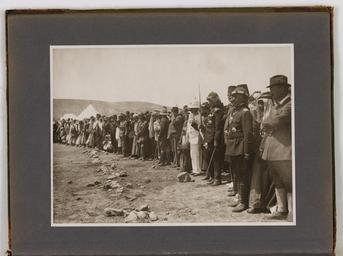 | Keywords: Meetings of British, Arab, and Bedouin officials in Amman, Jordan, April 1921 - File 07.tif en Photographs show meetings between Arab Bedouin and British officials around April 17-27 1921 at Amir Abdullah ibn Hussein's camp at Amman Jordan During these meetings British High Commissioner Herbert Samuel proclaimed Amir Abdullah as the ruler of Transjordan under British protection Among the persons depicted are Amir Abdullah John D Whiting possibly Sheik Sultan of the Belka Sultan ibn 'Ali id Diab ul 'Adwan Amir Shaker bin Zeid future Regent of Transjordan Bedouin chief Auda Abu Tayi Sheik Majid Pasha el Adwan Herbert Samuel British civil administrator Wyndham Deedes British diplomat Albert Abramson T E Lawrence Lawrence of Arabia and possibly Iraq civil administrator Gertrude Bell Also shown are horse racing an airplane landing at Abdullah's camp Circassian leaders Abudullah's bodyguard on camels and Herbert Samuel reading his proclamation of Abdullah as leader of Transjordan Reproduction Number LC-DIG-ppmsca-15304 digital files of original photos LC-DIG-ppmsca-15305 digital files of album pages Rights Advisory No known restrictions on publication Access Advisory For reference access please use the digital images in the online catalog to preserve the fragile original items Notes Photographs were created by the photographers of the American Colony Photo Department located in Jerusalem Founded in the late 1890s by Elijah Meyers the photo agency was headed during its heyday ca 1903-1933 by Lewis Larsson whose staff photographers included Erik Lind Lars Lind Furman Baldwin and G Eric Matson It transitioned into the Matson Photo Service around 1940 with photography by Matson Hanna Safieh Joseph H Giries and others John D Whiting contributed periodically to the work of both agencies The images in this album were probably taken by Lewis Larsson and/or Eric Matson For more information see http //hdl loc gov/loc pnp/pp matpc and http //www loc gov/rr/print/coll/629_whiting html Some caption information for these photographs based on information from matching negatives in the G Eric and Edith Matson Photograph Collection LC-M32-1942 LC-M32-1952 LC-M32-1951 LC-M32-1954 LC-M32-1956 M32-1957 and LC-M32-50280-x Album unpaginated album page numbers supplied by Library staff Pages 1-2 and verso of each page are blank One unattached photograph was found with the album and is stored with it Photograph is a portrait of a Jordanian man in traditional dress Blind stamp Hagop Berberian Amman Stamped on verso Copyright reserved By appointment to H M the King photographers Hagop Berberian Son More information about the events and people depicted in the album are available in the John D Whiting Supplementary Archive Box 1 LOT title devised by Library staff John D Whiting's diaries correspondence and other materials are located in the Library of Congress Manuscript Division Papers of John D Whiting Forms part of Visual materials from the papers of John D Whiting Library of Congress Transfer; Manuscript Division; 2006; DLC/PP-2006 051 29 Subjects Samuel Herbert Louis Samuel --Viscount --1870-1963 Lawrence T E -- Thomas Edward --1888-1935 Abdullah --King of Jordan --1882-1951 Deedes Wyndham Henry --Sir --1883-1956 Shākir ibn Zayd --Prince son of Zayd ibn Fawwāz Amir of Ṭāʾif --1885-1934 Bell Gertrude Lowthian --1868-1926 Jordan--History--1919-1946 American Colony Jerusalem --People--1920-1930 British--Jordan--Amman--1920-1930 Arabs--Jordan--Amman--1920-1930 Bedouins--Jordan--Amman--1920-1930 Circassians--Jordan--Amman--1920-1930 Tribal chiefs--Jordan--Amman--1920-1930 Meetings--Jordan--Amman--1920-1930 Camps--Jordan--Amman--1920-1930 Government officials--Jordan--Amman--1920-1930 Biplanes--Jordan--Amman--1920-1930 Proclamations--Jordan--Amman--1920-1930 April 17-27 1921 http //www loc gov/pictures/item/mpc2010001545/PP/resource/ Whiting John D John David 1882-1951 photographer Larsson Lewis photographer Matson G Eric Gästgifvar Eric 1888-1977 photographer other versions Wikimedia Levant - GLAM PD-Jordan 1921 Herbert Samuel and Amir Abdullah meetings |