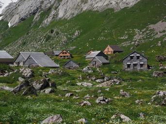 Keywords: meglisalp bergdorf homes alm alpine village appenzell innerrhoden alpstein region destination church chapel migratory goal säntis region