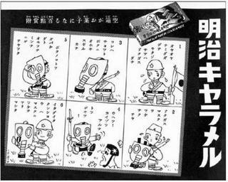| Keywords: Meiji caramels advertisement.jpg en Meiji caramels advertisement depicting a Japanese soldier wearing a gas mask and a Chinese soldier who had never seen a gas mask before 1938-10-19 Certain victory images of World War II in the Japanese media By David C Earhart 写 周報 Shashin Shūhō Custom license marker 2013 06 26 PD-Japan-oldphoto Uploaded with UploadWizard Propaganda of Japan Advertisements 1938 advertisements | ||||