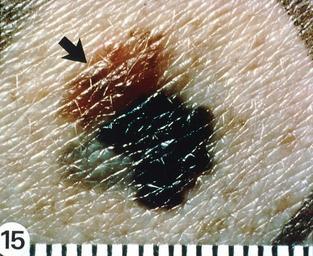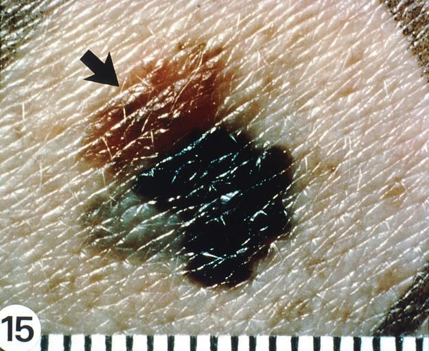 | Keywords: Melanoma4.jpg Superficial spreading melanoma arising from a dysplastic nevus The 4-by-8-mm pink-tan lesion with irregular borders at the upper left arrow is a dysplastic nevus Arising from it is an invasive malignant melanoma with its characteristic blue-black color notched border and distorted surface The gray area at the lower left represents tumor regression <br> Topics/Categories Pathology -- Patient<br> Type Color Slide <br> Source National Cancer Institute<br> Author Unknown photographer/artist <br> AV Number AV-8500-3699 <br> Date Created 1985 <br> Date Entered 1/1/2001 <br> Access Public http //visualsonline cancer gov/details cfm imageid 2181 PD PD-USGov Superficial spreading melanoma |