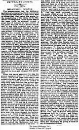 | Keywords: Melbourne v Carlton 1877.jpg First match of 1877 between Melbourne Carlton from the http //www nla gov au/ndp/ National Library Australian newspapers digitisation program which are pre-1955 so no copyright The service includes newspapers published in each state and territory from the 1800s to the mid-1950s when copyright applies http //www nla gov au/ndp/ National Library Australian newspapers digitisation program 1877-06-11 The Argus Melbourne Vic PD-Australia History of Australian rules football Melbourne Football Club Carlton Football Club Newspapers of Australia National Library of Australia - Australian Newspapers Service |