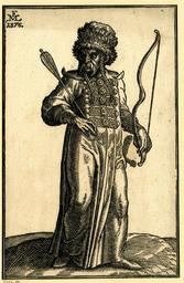 | Keywords: Melchior Lorck - A Tartar archer.jpg en A Tartar archer; whole-length figure his head turned to left; holding a bow in his left hand and arrow in his right hand; the hilt of his sword visible next to his left hand; from a series of 127 woodcuts 1576 Woodcut 1576 http //www britishmuseum org/research/collection_online/collection_object_details aspx objectId 1449342 partId 1 searchText lorck page 1 creator Melchior Lorck other versions PD-old-70-1923 The Turkish Publication by Melchior Lorck |