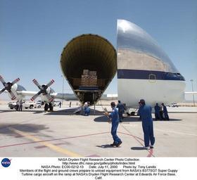 | Keywords: Members of the flight and ground crews prepare to unload equipment from NASA's B377SGT Super Guppy T DVIDS727520.jpg en Members of the flight and ground crews prepare to unload equipment from NASA's B377SGT Super Guppy Turbine cargo aircraft on the ramp at NASA's Dryden Flight Research Center at Edwards Air Force Base Calif The outsize cargo plane had delivered the latest version of the X-38 flight test vehicle to NASA Dryden when this photo was taken on June 11 2000 The B-377SGT Super Guppy Turbine evolved from the 1960s-vintage Pregnant Guppy Mini Guppy and Super Guppy used for transporting sections of the Saturn rocket used for the Apollo program moon launches and other outsized cargo The various Guppies were modified from 1940's and 50's-vintage Boeing Model 377 and C-97 Stratocruiser airframes by Aero Spacelines Inc which operated the aircraft for NASA NASA's Flight Research Center assisted in certification testing of the first Pregnant Guppy in 1962 One of the turboprop-powered Super Guppies built up from a YC-97J airframe last appeared at Dryden in May 1976 when it was used to transport the HL-10 and X-24B lifting bodies from Dryden to the Air Force Museum at Wright-Patterson Air Force Base Ohio NASA's present Super Guppy Turbine the fourth and last example of the final version first flew in its outsized form in 1980 It and its three sister ships were built in the 1970s for Europe's Airbus Industrie to ferry outsized structures for Airbus jetliners to the final assembly plant in Toulouse France It later was acquired by the European Space Agency and then acquired by NASA in late 1997 for transport of large structures for the International Space Station to the launch site It replaced the earlier-model Super Guppy which has been retired and is used for spare parts NASA's Super Guppy Turbine carries NASA registration number N941NA and is based at Ellington Field near the Johnson Space Center For more information on NASA's Super Guppy Turbine log onto the Johnson Space Center Super Guppy web page at http //spaceflight nasa gov/station/assembly/superguppy/ NASA Identifier NIX-EC00-0212-13 2009-09-23 Glenn Research Center https //www dvidshub net/image/727520 727520 2012-10-17 14 04 WASHINGTON DC US PD-USGov Aircraft at Edwards Air Force Base Wright-Patterson Air Force Base Images from DoD uploaded by Fæ |