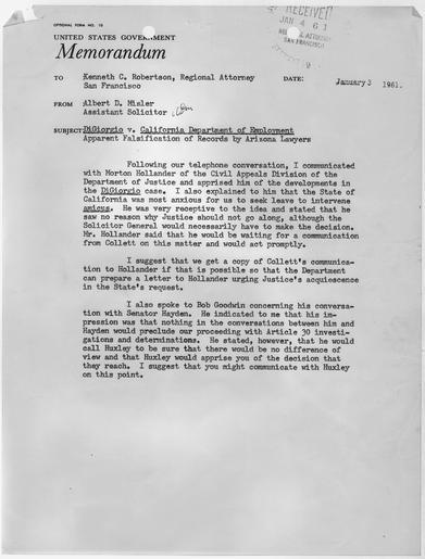 | Keywords: Memo "DiGiorgio v. California Department of Employment, Apparent Falsification of Records by Arizona Lawyers," from... - NARA - 296726.tif Scope and content This document is related to the Bracero Program a federally sponsored labor program during the 1950s-early 1960's whereby migrant/migratory laborers from Mexico were provided for seasonal mostly agricultural employment often on the farms of Californa growers The document provides insight into Hispanic/Latino/Mexican immigration and labor history including controversies which surfaced during the farm labor movement of the years thereafter General notes 296726 Local identifier Department of Labor Office of the Solicitor Region 9 San Francisco Office of the Regional Attorney 1965 - 1973 NARA's Pacific Region San Bruno NRHAS 1000 Commodore Drive San Bruno CA 94066-2350 1961-01-03 Record group Record Group 174 General Records of the Department of Labor 1907 - 2001 Record group ARC 503 Records Relating to the Mexican Labor Bracero Program compiled 1950 - 1964 Series ARC 296723 File unit DiGiorgio Fruit Corp v Cal St Dept Empl 1960 - 1961 File unit ARC 296724 Variant control numbers NAIL Control Number NRHS-174-REG9BRACERO-DIGIORGIO-2 yes Other versions NARA-cooperation PD-USGov Agriculture in the United States Courts of the United States 1961 |