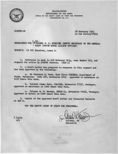 | Keywords: Memorandum from Colonel Seitz to Colonel Hoskot Re, James McAndrew February 28, 1963 - NARA - 194132.tif Scope and content Memorandum from Colonel Richard J Seitz to Colonel N R Hoskot concerning draft reply for Mrs Bobbie Lou Pendergrass General notes 194132 Local identifier President 1961-1963 Kennedy Office of the President 01/20/1961 - 11/22/1963 John F Kennedy Library NLJFK Columbia Point Boston MA 02125-3398 1963-02-28 Record group Collection JFK-WHCF Papers of President Kennedy White House Central Files 01/20/1961 - 11/22/1963 Record group ARC 1176 Papers of President Kennedy White House Central Files White House Subject File compiled 01/20/1961 - 11/22/1963 Series ARC 194123 File unit Papers of President Kennedy White House Central Files White House Subject File National Security - Defense 01/20/1961 - 11/22/1963 File unit ARC 194127 Variant control numbers NAIL Control Number NLK-WHCF-SBJCTFL-ND922M-MEMOREMCANDREW yes Other versions NARA-cooperation PD-USGov Documents in English |