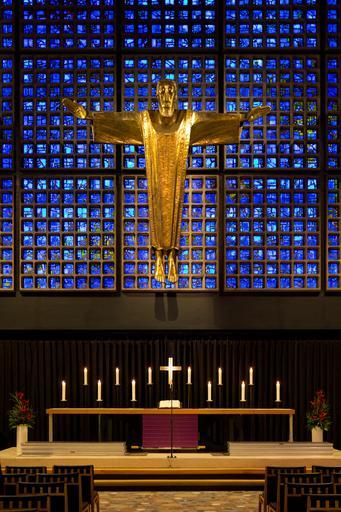 Keywords: memorial church modern altar gold cruciform christ vibrant stained glass geometric candles berlin christianity kaiser-wilhelm-gedächtnis-kirche