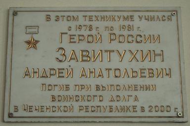| Keywords: Memorial plaque Zavituhin 4.jpg en Russia Vologda Vologda Rail College memorial plaque in honor of Hero of Russia - Zavituhin Andrey ru Россия Вологда Вологодский техникум железнодо ожного т анспо та Памятная табличка в честь Ге оя России - Завитухина Анд ея Анатольевича Own Sergeev Pavel 2010 Plaques in Vologda Andrey Zavituhin |