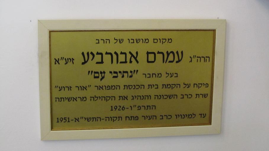 Keywords: Memorial Rabbi Amram Aburbeh at Or Zaruaa Synagogue.JPG en Rabbi Amram Aburbeh memorial plaque at Or Zaruaa synagogue Jerusalem Israel Rabbi Amram Aburbeh served as the synagogue rabbi from 1927 till 1951 he וח הנצחה רב עמר אבורביע בבית הכנסת אור זרוע בשכונת נח אות בירוש י הרב עמר אבורביע כיהן כרב בית הכנסת מהקמתו בשנת 1926 ועד 1951 2013-10-22 19 16 03 own Sefer book cc-zero Uploaded with UploadWizard Memorabilia Plaques in Jerusalem Or Zaruaa synagogue Rabbis |