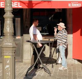 Keywords: men friends togetherness interview confidential friendship smoking cigarette antwerp grand place street street photography cafe terrace