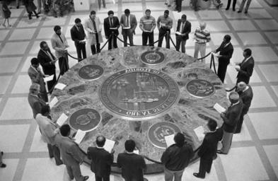 | Keywords: florida tallahassee african american men africanamericanmen celebrations martin luther king, jr. martinlutherkingjr ceremonies holidays state seals stateseals blackandwhite monochrome black and white Persistent URL: floridamemory.com/items/show/134161 Local call number: MF0298 Title: Men gather around the Florida Seal to honor Dr. Martin Luther King - Tallahassee Date: January 20, 1986 Physical descrip: 1 photonegative - b&w - 35 mm. Series Title: Mark Foley Collection Repository: State Library and Archives of Florida 500 S. Bronough St., Tallahassee, FL, 32399-0250 USA, Contact: 850.245.6700, Archives@dos.myflorida.com Persistent URL: floridamemory.com/items/show/134161 Local call number: MF0298 Title: Men gather around the Florida Seal to honor Dr. Martin Luther King - Tallahassee Date: January 20, 1986 Physical descrip: 1 photonegative - b&w - 35 mm. Series Title: Mark Foley Collection Repository: State Library and Archives of Florida 500 S. Bronough St., Tallahassee, FL, 32399-0250 USA, Contact: 850.245.6700, Archives@dos.myflorida.com |