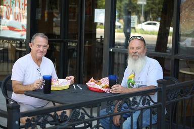 Keywords: men lunch restaurant two eating beard elderly seniors senior person old man people adult aged happy male white elder gray hair grandfather lifestyle smiling casual looking older smile grey mustache biker rough tough