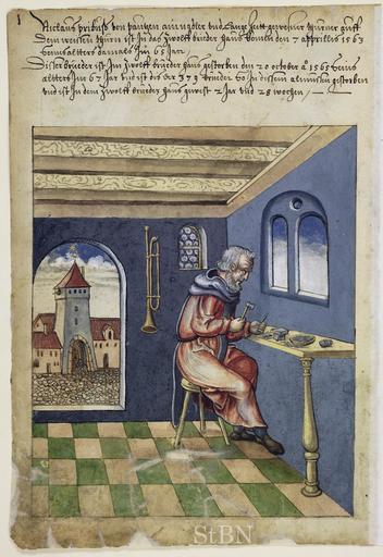 | Keywords: Mendel II 019 v.jpg Niclaus Nikolaus; Nicolaus Pribuß Pribus nadler; thurner Nadler; Türmer Transkription und weitere Informationen siehe http //www nuernberger-hausbuecher de/75-Amb-2-317b-19-v/data Hausbuch der Mendelschen Zwölfbrüderstiftung Band 2 Nürnberg 1550 “1791 Stadtbibliothek Nürnberg Amb 317b 2° via http //www nuernberger-hausbuecher de/ 1565 anonymous PD-old-100 Hausbuch der Mendelschen Zwölfbrüderstiftung Band 2 Needlemakers in art Tower watchmen in art Trumpets in art |