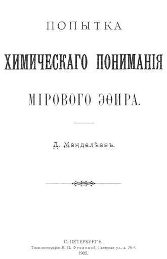 | Keywords: Mendeleev Ether Cover 1905.png ru Обложка книги Химическое понимание ми ового эфи а 1905 http //ether-wind narod ru/Mendeleev_1905/ енделеев Д И File Mendeleev An attempt towards a chemical Conception of the Ether 1904 jpg PD-Art Uploaded with UploadWizard Literary works by Dmitri Mendeleev |