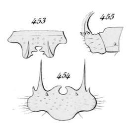 | Keywords: Menephilus cylindricus larva detail2.png en abdominal appendices of larva of Menephilus cylindricus from different views<br>Fig 453 upside; Fig 454 from behind Fig 455 from side<br> after Éduard Perris Histoire des insectes du pin maritime Paris 1863 from plate 8 1857 Fig 444 - Fig 457 Éduard Perris Histoire des insectes du pin maritime Perris Plate 8 1857 1857 Menephilus cylindricus PD-old | ||||