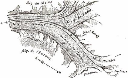 | Keywords: Mer de Glace sketchmap by John Tyndall, 1857, from 1896 edition.png Mer de Glace sketchmap by John Tyndall 1857 Fig 7<ref>Tyndall page 53 Fig 7 </ref> shows Aiguille Noire to the south bottom-right dividing the Cascade at the west bottom from Glacier des Périades right which flows north to join Glacier du Géant flowing south to north 14 degrees clockwise between Mont Tacul on the east centre right and Aiguilles de Charmoz to the west bottom alongside morraine 'b' This forms the medial morraine 'a' Some 3 kilometres downstream Glacier de Lechaud joins du Géant forming medial morraine 'c' Just prior to this confluence Cascade du Talèfre with its own medial morraine 'e' joins Lechaud forming morraine 'd' Here the glacier is known as the Mer De Glace and flows north-north-west leftwards between Aiguille du Moine on the east and Trélaporte on the west Notes 2 References cite book The Glaciers of the Alps John Tyndall 1896 Longmans Green and Co http //www archive org/details/glaciersalpsbeing00tyndrich 2008-02-29 PDF from http //www archive org/details/glaciersalpsbeing00tyndrich or alternative http //books google it/books id 8_cN1DQ3mZ4C printsec frontcover hl en PPA53 M1 1896 John Tyndall 1820-1893 PD-old Maps of glaciers Mer de Glace Glacier de Leschaux Glacier du Tacul Glacier de Trélaporte Glacier des Périades Glacier de Talèfre John Tyndall 1896 maps Maps of Haute-Savoie Engraved maps Maps of confluences of glaciers |