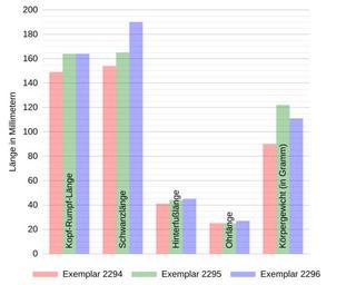 | Keywords: Meriones persicus, YiÄŸit & Çolak 1999, body measurements (DE).svg de Körpermaße dreier erwachsener männlicher Persischer Rennmäuse Meriones persicus aus Oltu Erzurum Türkei auf Deutsch en Body measurements of three adult male Persian Jirds Meriones persicus from Oltu Erzurum Turkey in German own Torben Schink 2011-01-13 nach Nuri YiÄŸit Ercüment Çolak A study of the taxonomy and karyology of Meriones persicus Blanford 1875 Mammalia Rodentia in Turkey In Turkish Journal of Zoology Bd 23 Nr 3 1999 ISSN 1300-0179 S 269 “274 http //mistug tubitak gov tr/bdyim/abs php dergi zoo rak 98066 PDF 191 KB Tab 1 S 271 erstellt mit Gnuplot 4 4 DATA <pre> 2294 2295 2296 Kopf-Rumpf-Länge 149 164 164 Schwanzlänge 154 165 190 Hinterfußlänge 41 44 45 Ohrlänge 25 25 27 Körpergewicht in Gramm 90 122 111 </pre> CODE <pre> set terminal svg set encoding iso_8859_1 set decimalsign set border 0 set key outside center bottom horizontal Left reverse set xrange -0 5 4 5 unset xtics set ylabel Länge in Millimetern set yrange 0 200 set ytics out nomirror scale 0 01 0 20 200 format 0f set mytics 4 set grid ytics mytics lw 0 25 lc rgb 404040 lw 0 25 lc rgb C0C0C0 plot for SET 1 3 DATA using 0+ SET-2 0 25 column 1+SET 0 25 xtic 1 with boxes fs solid 0 33 noborder title Exemplar 2293+SET using 0 0 1 with labels rotate by 90 left offset 0 0 5 notitle </pre> Cc-zero Meriones persicus |